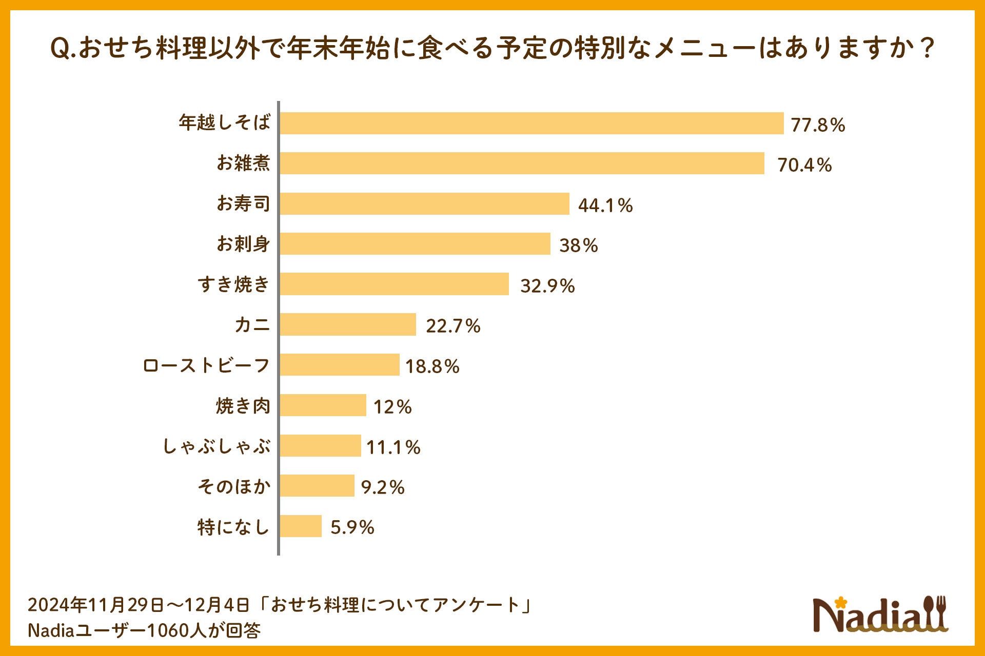 年末年始に食べる特別メニューについての質問では、年末の定番「年越しそば」や新年の定番「お雑煮」が上位にランクインし、そのほか「お寿司」「お刺身」「すき焼き」「カニ」「ローストビーフ」などがあがりました。おせち料理で余ってしまうメニューについては「余ることがない」という回答が半数近くを占めたものの、「お煮しめ・筑前煮」「黒豆」などが余るという声もありました。