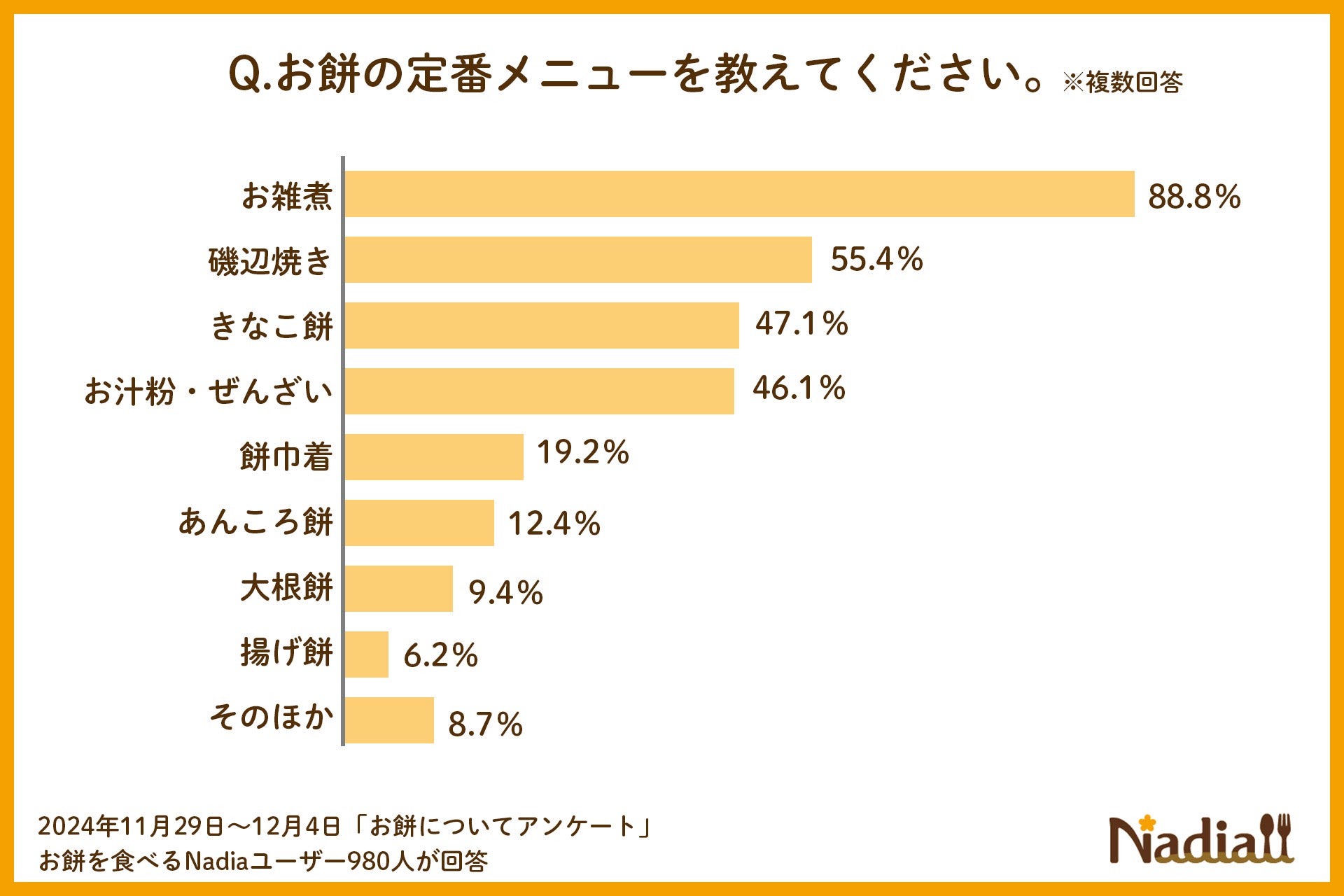 元日や鏡開きなど、お正月シーズンに食べる機会が多いお餅。「お餅についてのアンケート調査」(※2)によると、「お餅の定番メニューを教えてください」という質問では「お雑煮」が圧倒的人気で88.8%、続いて「磯辺焼き」が55.4%、「きなこ餅」が47.1%、「お汁粉・お雑煮」が46.1%という結果になりました。