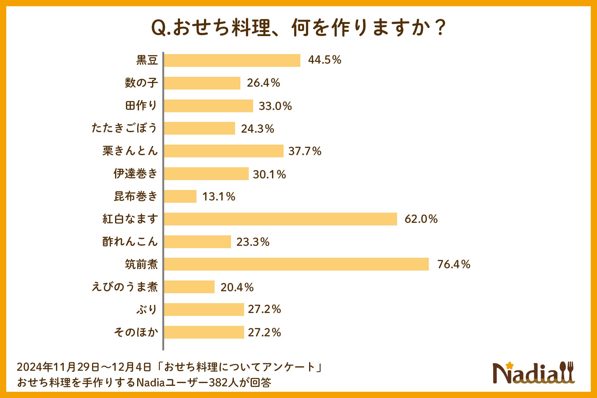 2025年まであと少し、新年といえばやはり「おせち料理」。「おせち料理についてのアンケート調査」(※1)にて、「おせち料理を手作りしますか?購入しますか?」の質問に対し、「基本的に全て手作りする」と答えた人は17.9%、「一部手作りし、一部購入する」と答えた人は57.4%にのぼり、何かしら手作りする人は75.3%という結果になりました。さらに「おせち料理、何を作りますか?」という質問では、上から「筑前煮」が76.4%、「紅白なます」が62.0%、「黒豆」が44.5%という結果に。