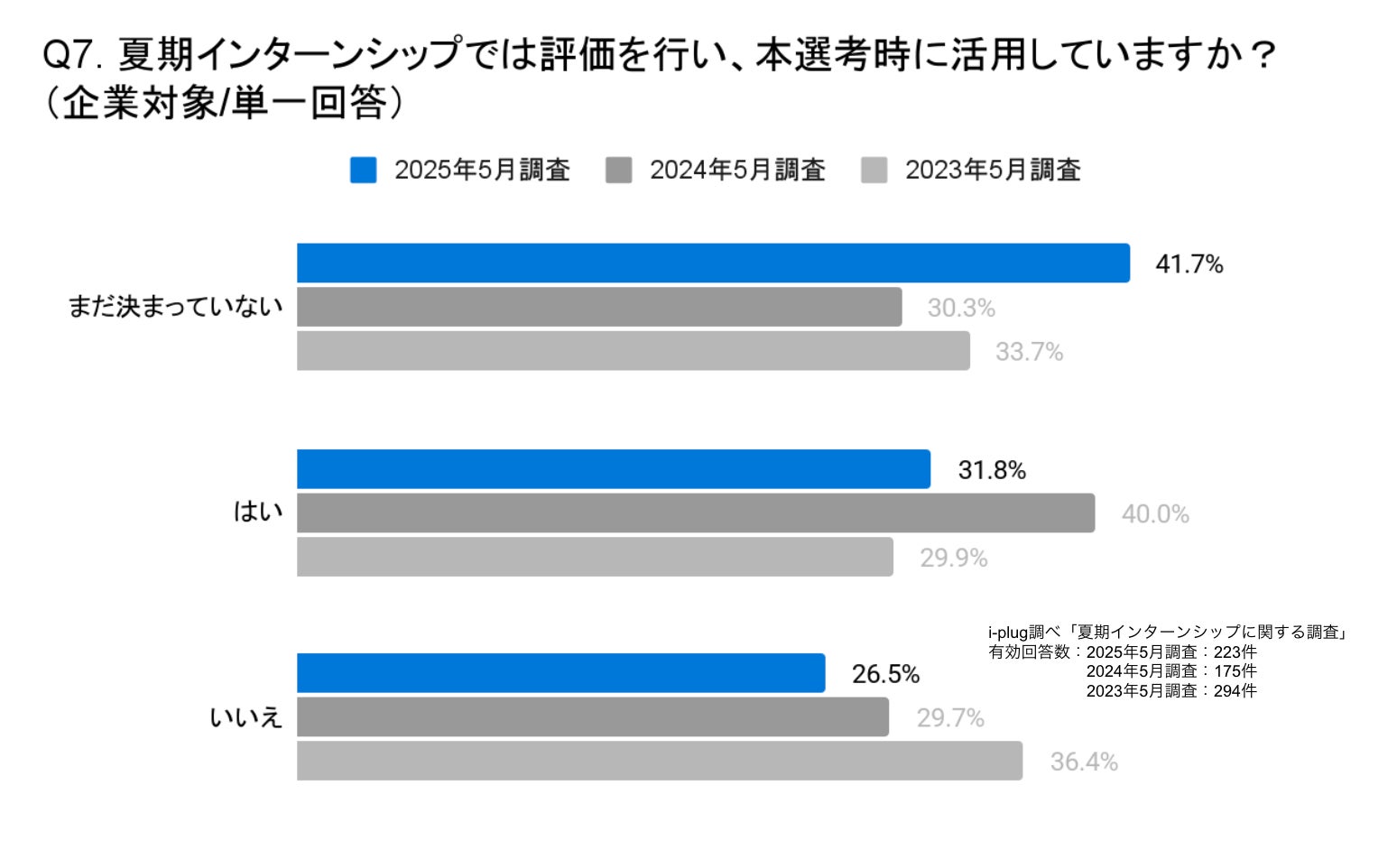 「まだ決まっていない」が最多の41.7%。昨年度の同様の調査と比較すると、11.4ポイント増加しました。一方で、「いいえ」と回答した企業は26.5%。2023年5月に実施した同様の調査と比べると、9.9ポイント減少していることから、今まで夏期インターンシップの評価を、本選考時に活用していなかった企業が、今後の採用活動で活用する可能性があると推測できます。