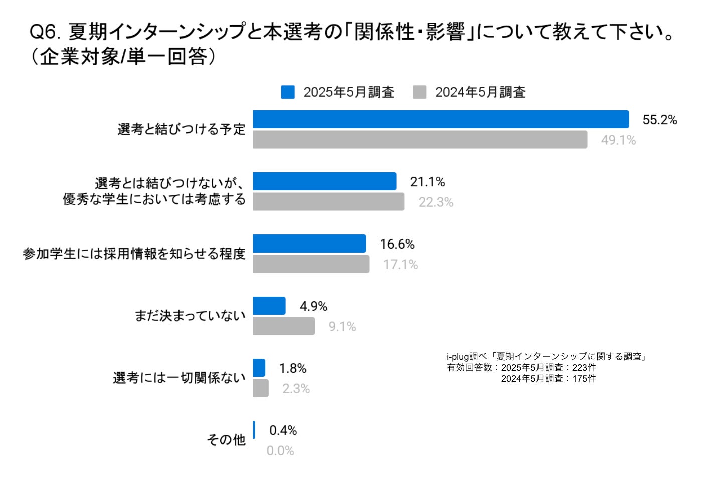 夏期インターンシップの開催予定のある企業に、夏期インターンシップと本選考の「関係性・影響」について伺ったところ、「選考と結びつける予定」と回答した企業が55.2%。昨年5月に実施した調査と比較して、6.1ポイント増加しました。