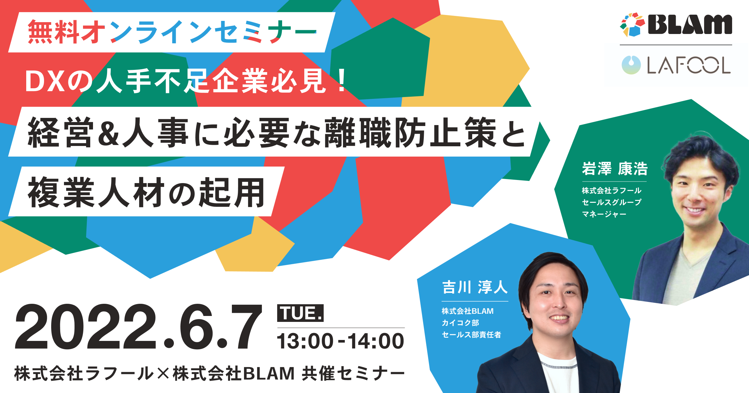 「個人が変われば、 組織が変わる」組織改善サーベイ『ラフールサーベイ』を提供するメンタルデータテック®の株式会社ラフール(本社:東京都中央区、代表取締役社⻑:結木啓太、代表取締役副社長:小梨明人、以下「ラフール」)は、株式会社BLAM(本社:東京都渋谷区、代表取締役:杉生 遊、以下「BLAM」)と『DXの人手不足企業必見! 経営&人事に必要な離職防止策と複業人材の起用』をテーマとした共催セミナーを2022年6月7日(火) に開催します。