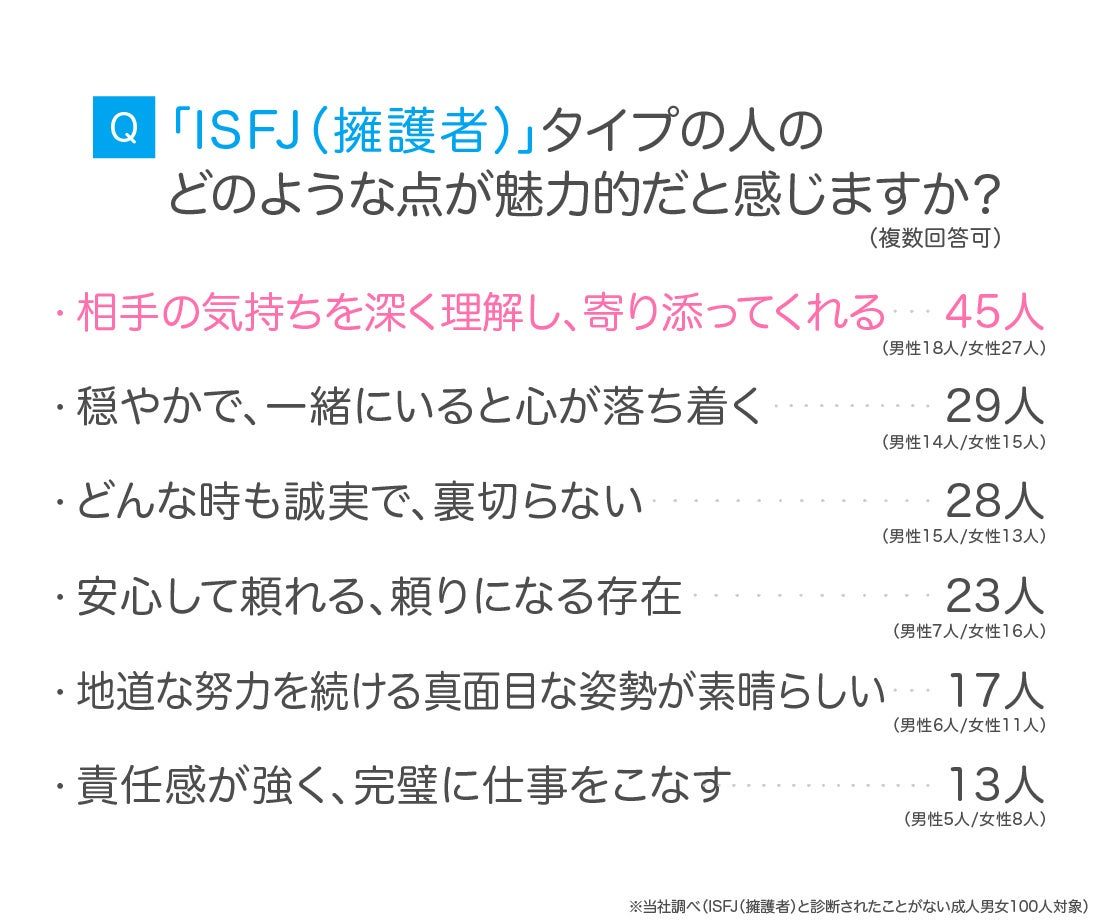 また、ISFJ(擁護者)タイプの人の性格の穏やかさや誠実さを評価する人も一定数いました。