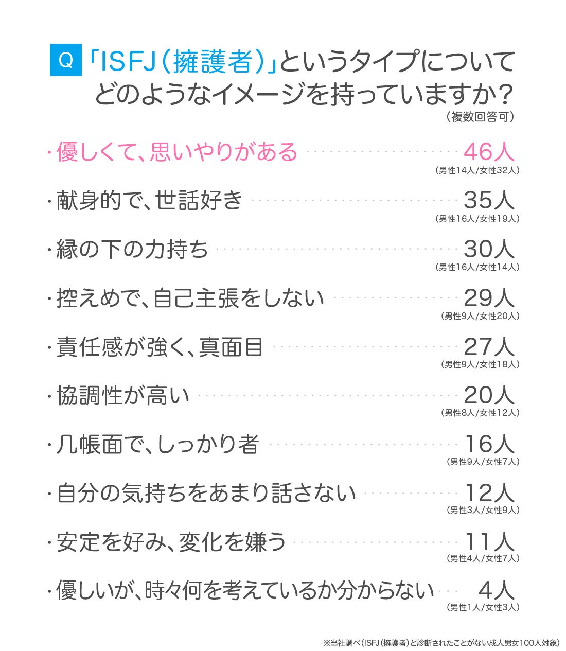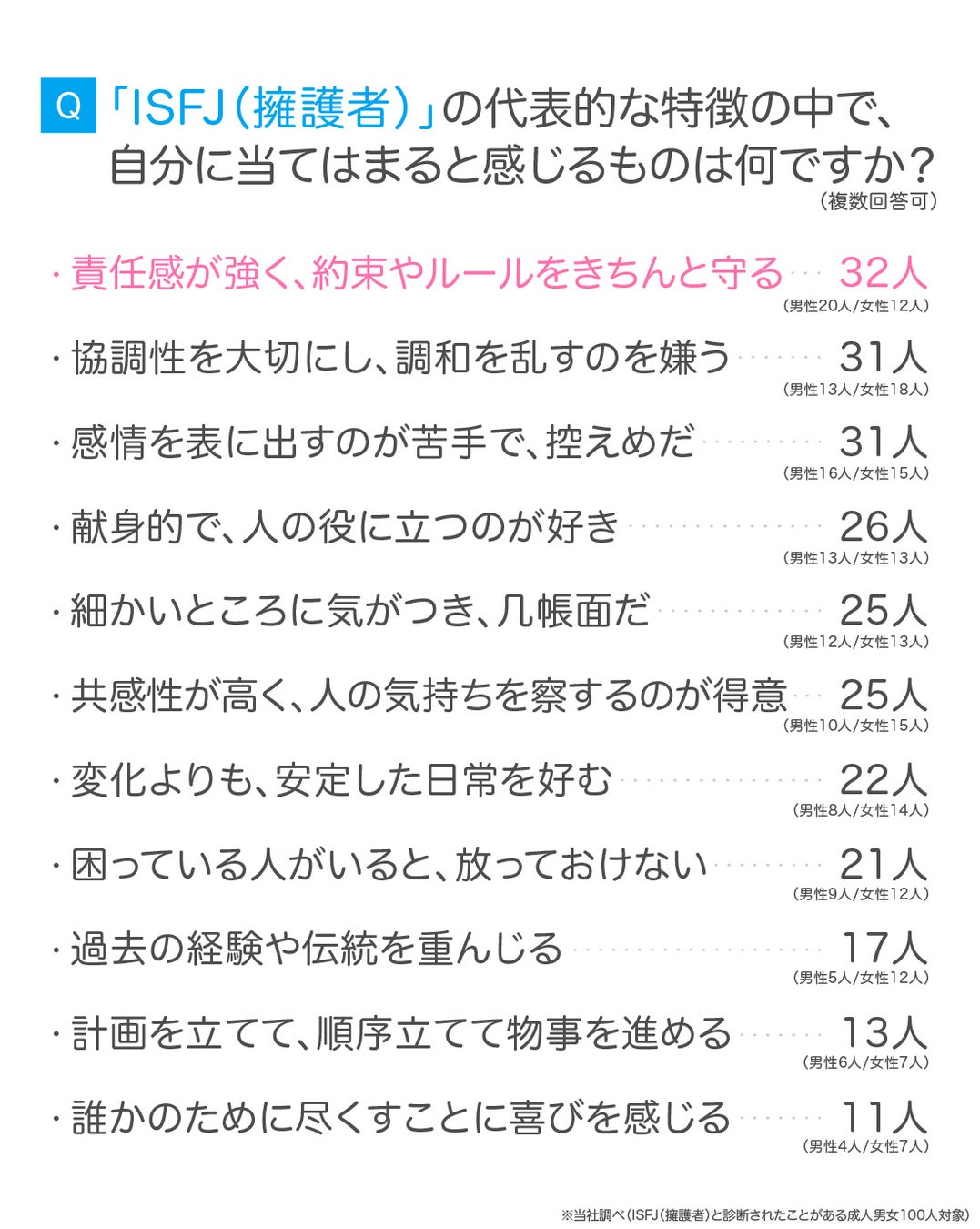 先ほどのアンケートとは別に、「ISFJ(擁護者)と診断されたことがある成人男女100人」を対象に実施したアンケート調査の結果を紹介します。