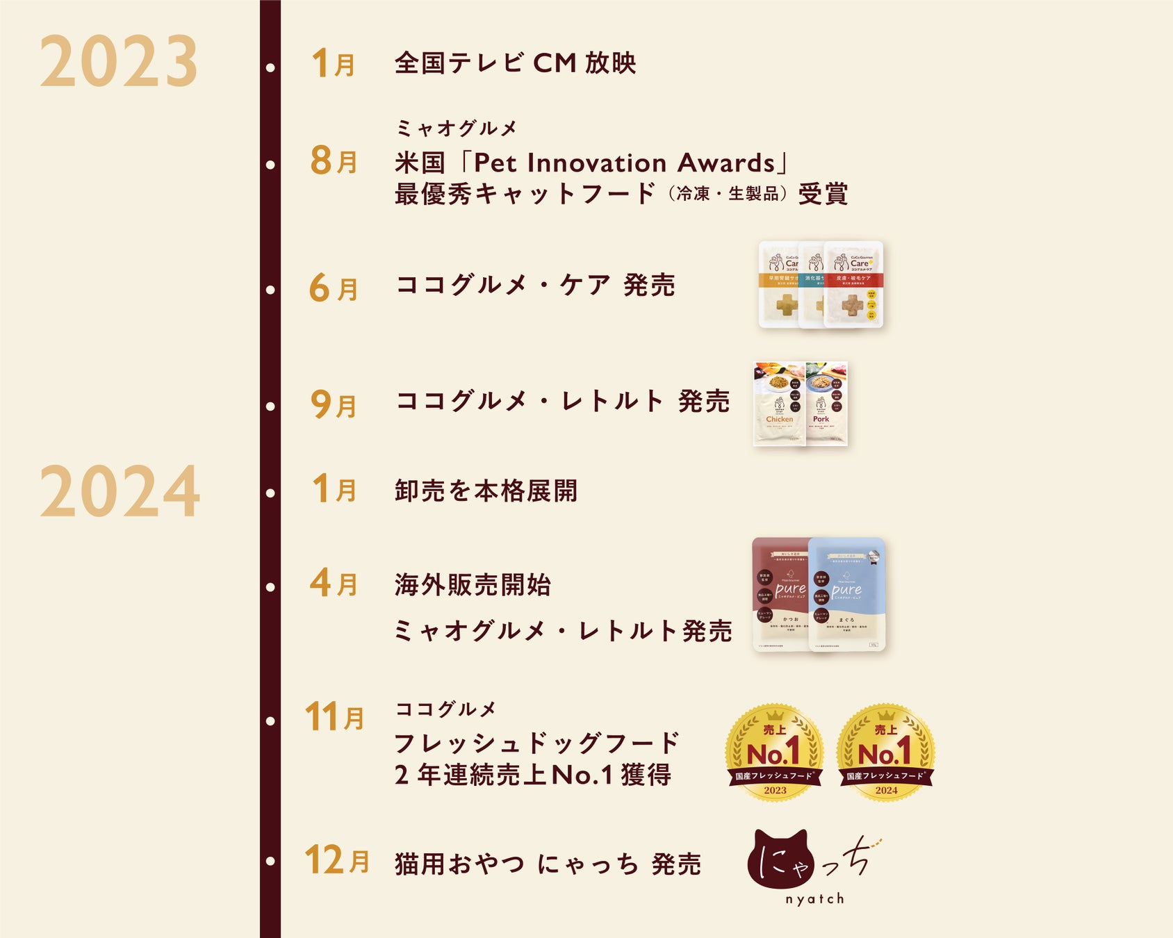 愛犬向け手づくりごはんブランド「ココグルメ」は、国内で珍しいフレッシュペットフード(冷凍ペットフード)のサブスクリプションサービスとして2019年6月に開始しトップシェアを獲得しています。さらに、2024年12月に発売した愛猫向け無添加(※3)ピューレおやつ「にゃっち」が好調に売り上げを伸ばし、猫の会員頭数は直近10ヶ月(2024年12月〜2025年9月)で216%成長となりました。