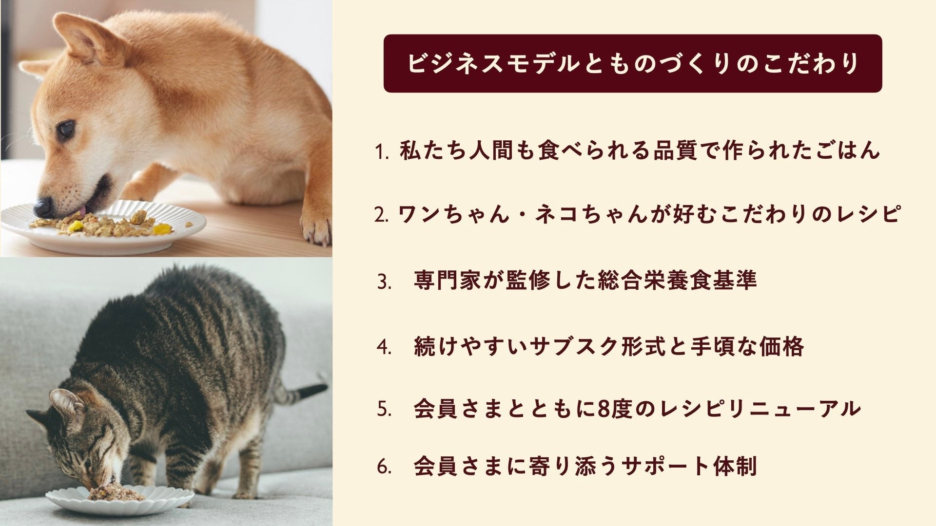 事業内容:フレッシュペットフード「ココグルメ」「ミャオグルメ」の製造及び販売などのペット事業