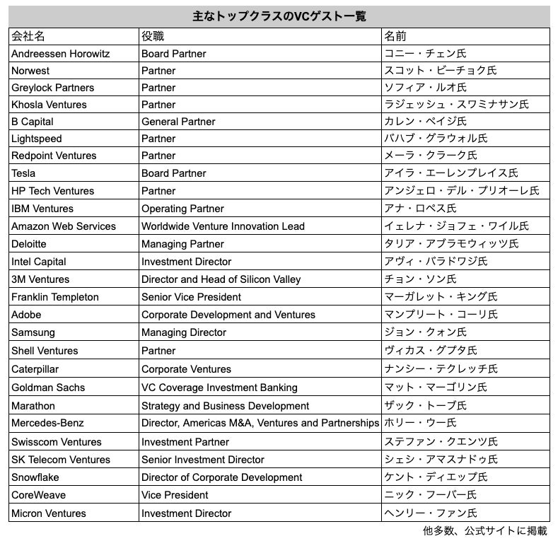 世界屈指の独立系ベンチャーキャピタルである、アンドリーセン・ホロウィッツ、グレイロック・パートナーズ、コスラ・ベンチャーズをはじめ、エイチピー・テック・ベンチャーズやアイビーエム・ベンチャーズといった世界のイノベーションを牽引するコーポレートベンチャーキャピタルまで、総勢400名を超える一流のベンチャーキャピタリストが一堂に会します。