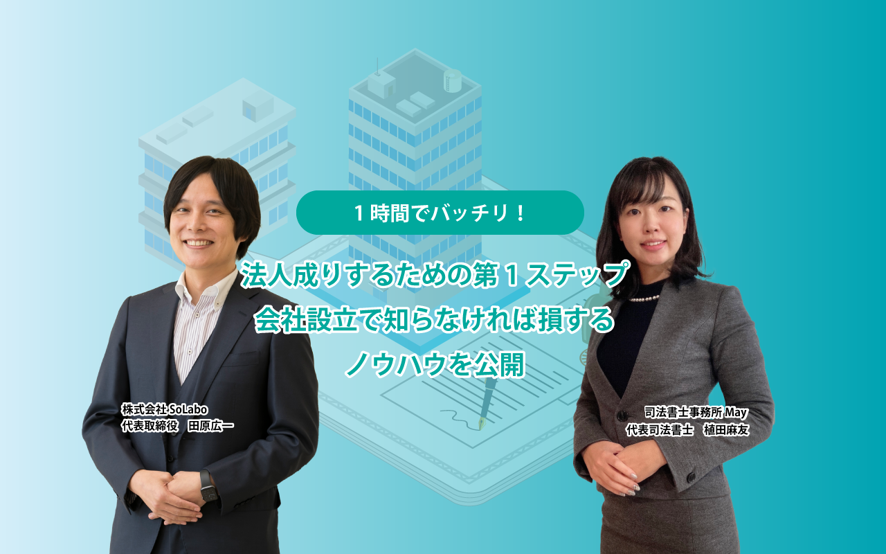 株式会社SoLabo(本社:東京都千代田区、代表取締役:田原広一)は、司法書士事務所May(本社:大阪府大阪市、代表司法書士:植田麻友)と共同で、会社設立時に知っておきたいノウハウをテーマとした無料セミナーを開催いたします。
