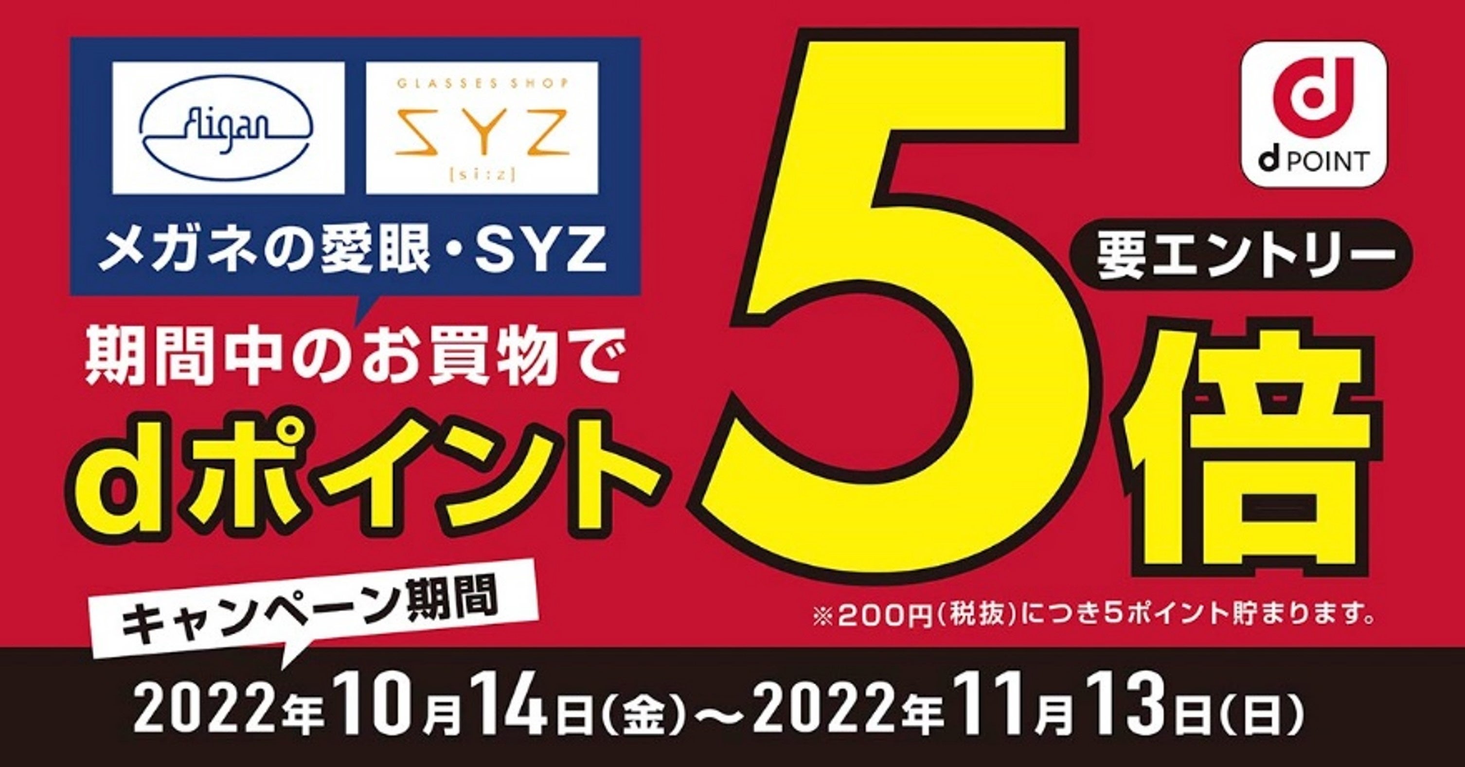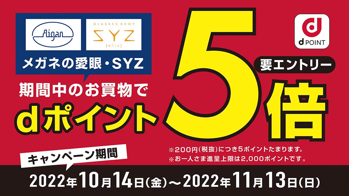 専用サイトでエントリーの上、期間中に全国のメガネの愛眼・アイウェアショップSYZ(シーズ)にてdポイントカードを提示してお買い上げいただくと、dポイントが5倍、進呈される企画となります。