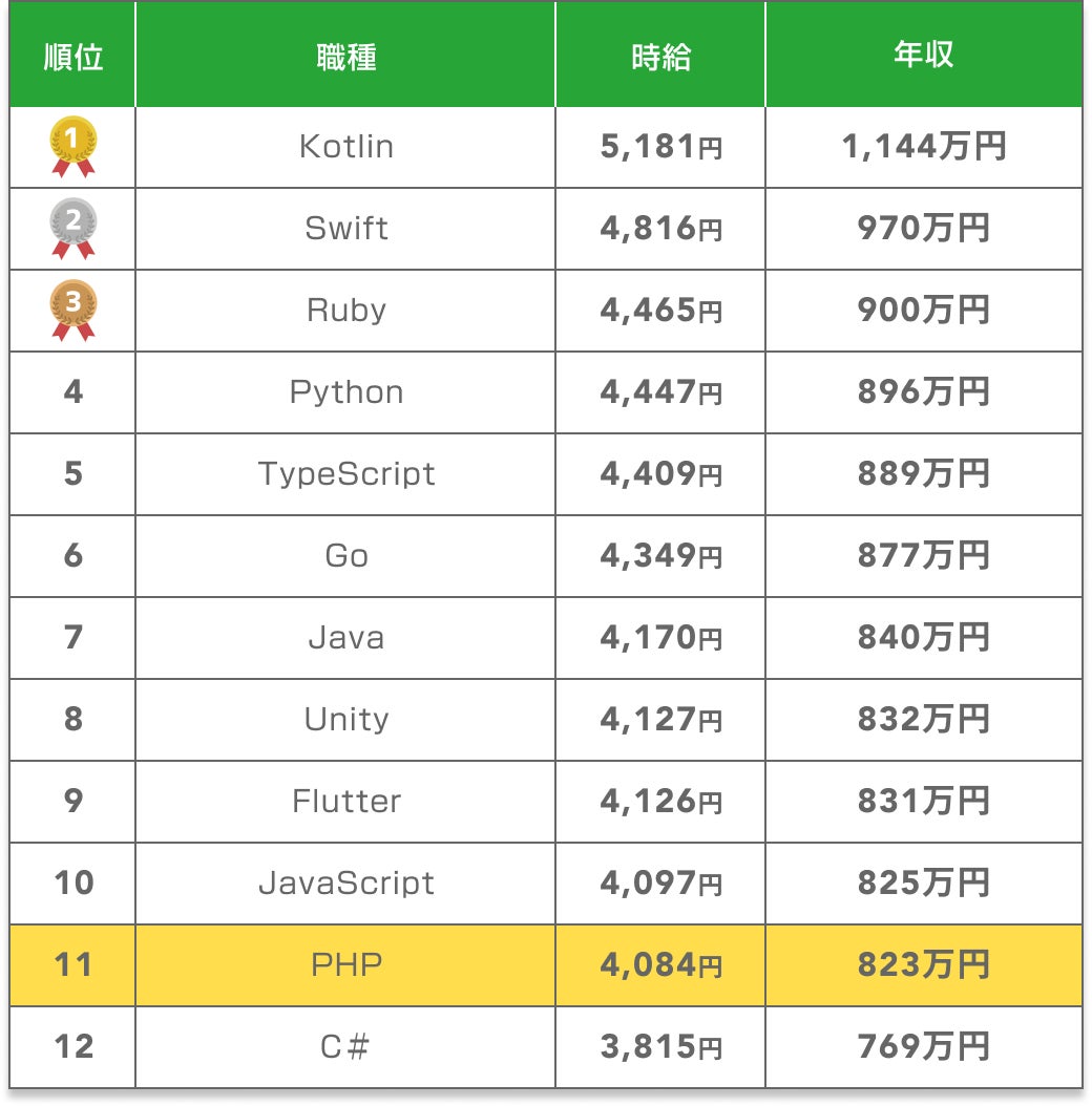 PHPエンジニアの市場価値は比較的高く、平均年収は823万円となっています。これはプログラミング言語の年収ランキングでは11位に位置しています。様々なウェブ開発プロジェクトで広く使用されているPHPは、依然として需要があり、経験豊富なエンジニアは安定した収入を得られる分野と言えるでしょう。