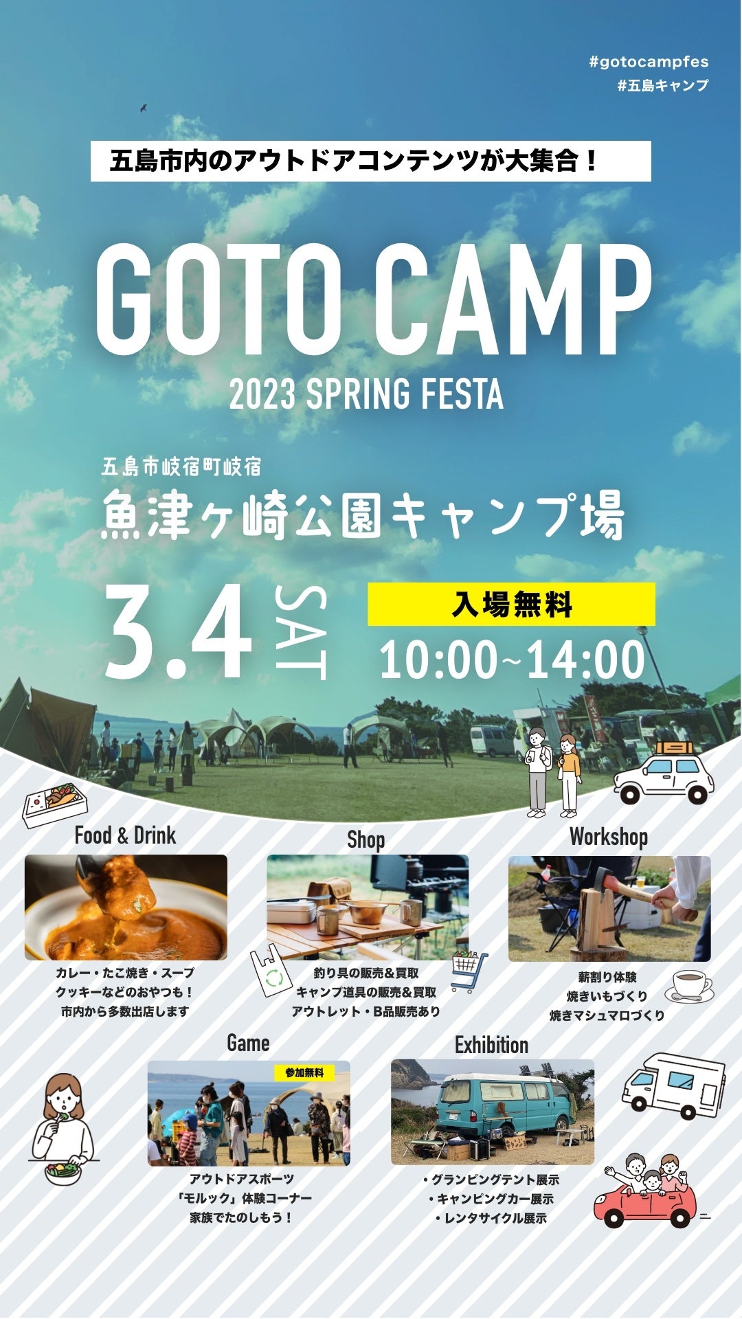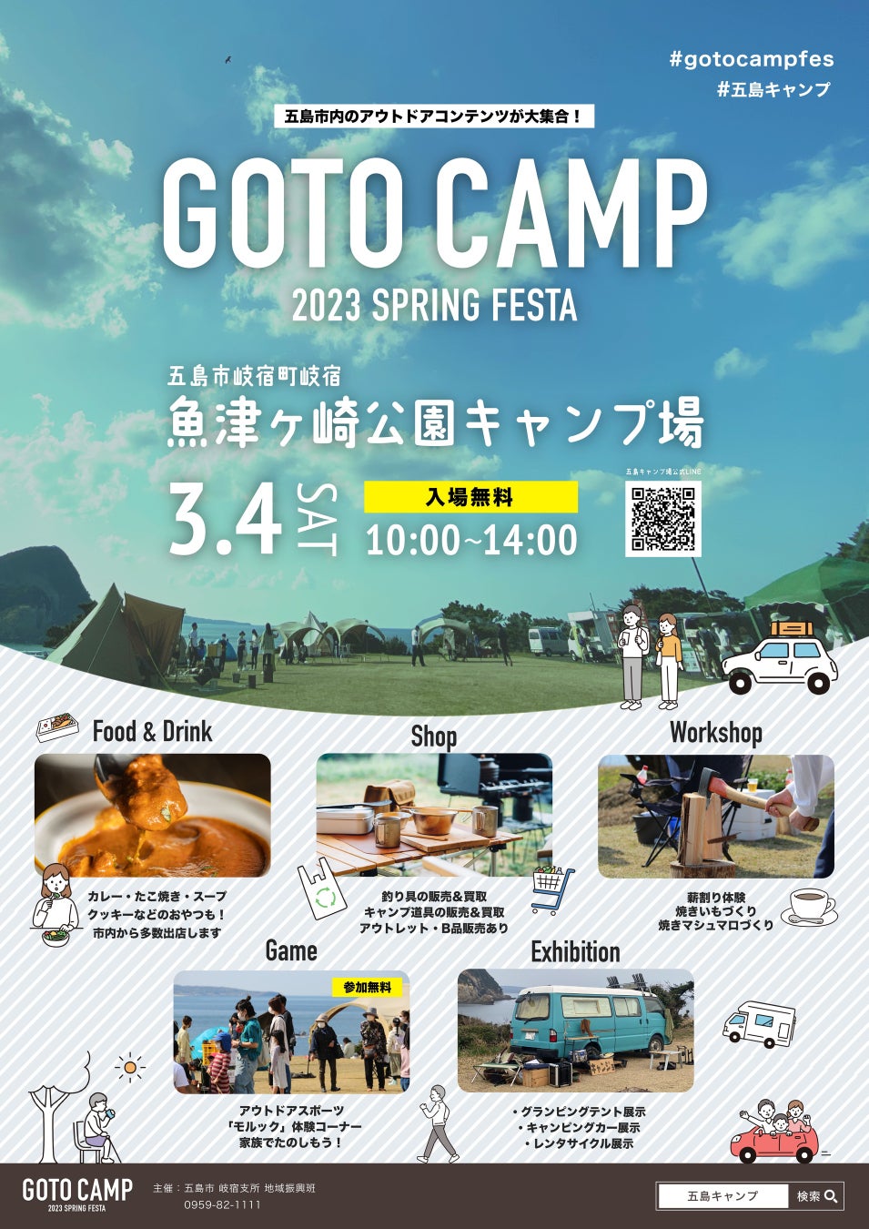 長崎県五島市にて、キャンプイベント「GOTO CAMP 2023 SPRING FESTA 」を2023年3月4日(土)魚津ヶ崎公園キャンプ場にて開催。