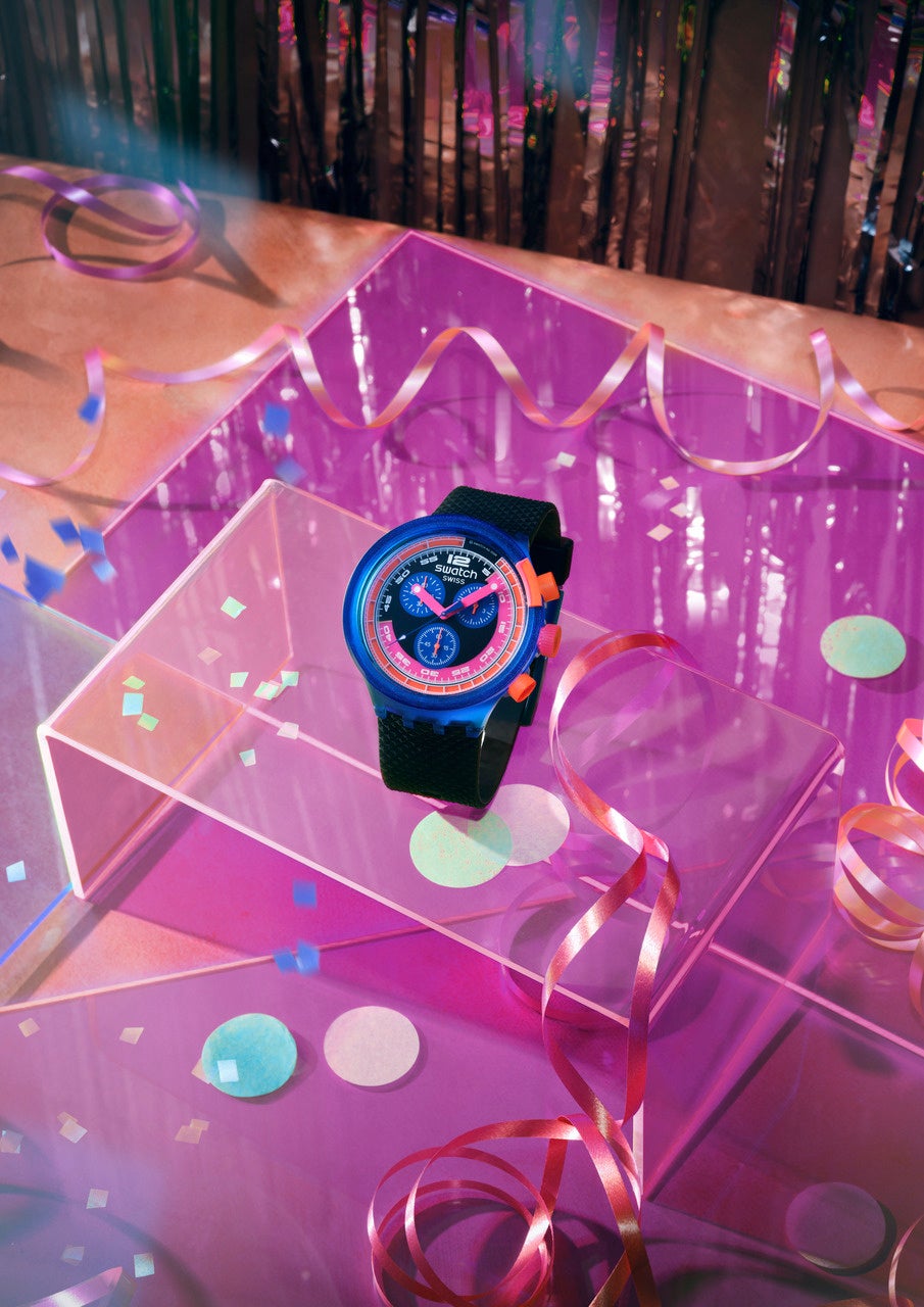 アイコニックな動きも、魅力的なレトロなスタイルも、羨望のまなざしを集める光景も。そんな90年代のクールなスタイルに最新のひねりを加えて形にしたSWATCH NEON PARTY TO THE MAXは、誰もがそうなりたい、あるいはお近づきになりたいと憧れるゲストのような存在です。