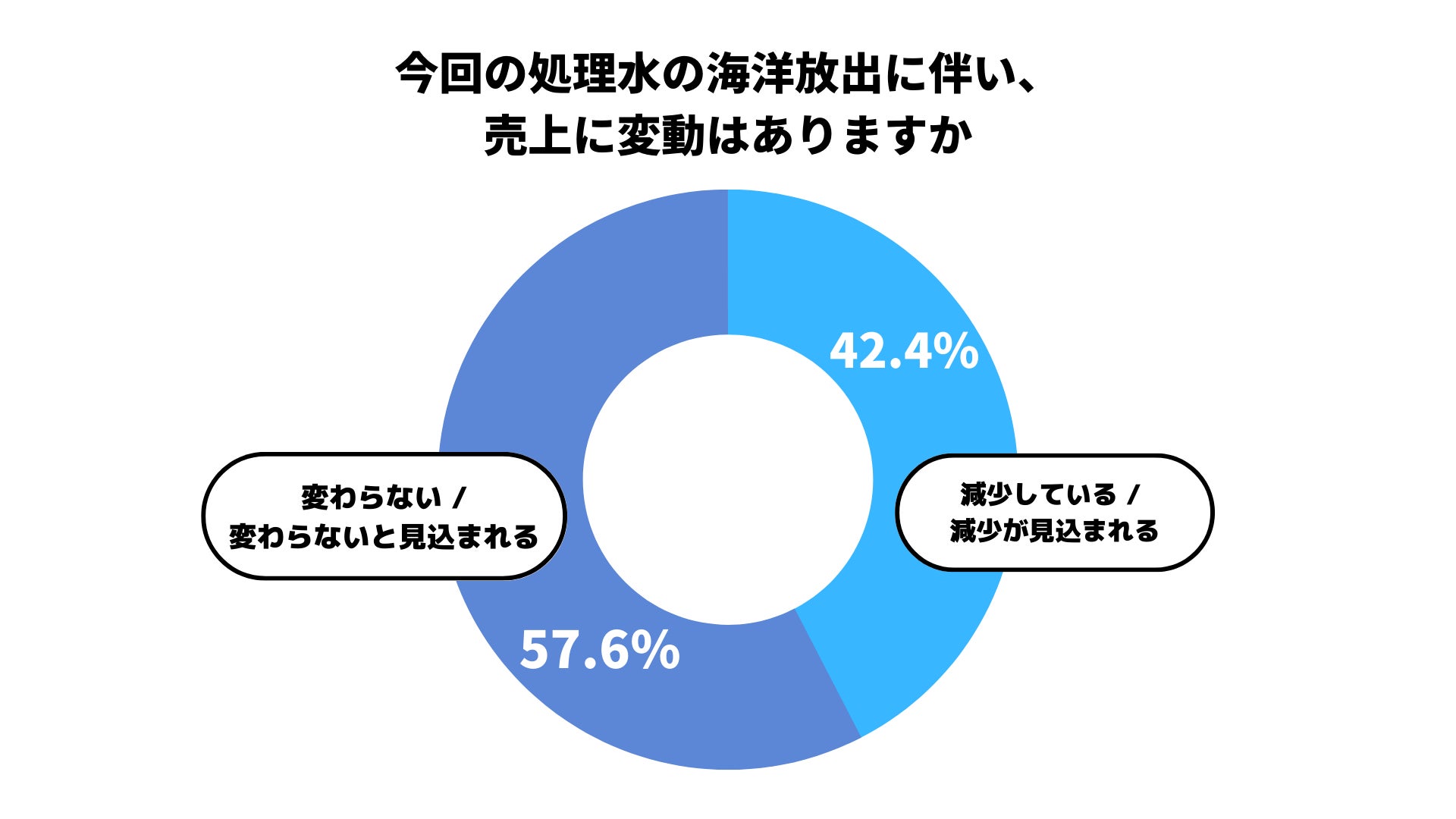 こうした状況を受け、当社では、本件が漁業者の売上に与える影響を調査すべく、全国のポケットマルシェ登録漁業者を対象にアンケートを行いました。その結果、4割超の方が「処理水の海洋放出に伴い、売上が減少している/減少が見込まれる」と回答しました。