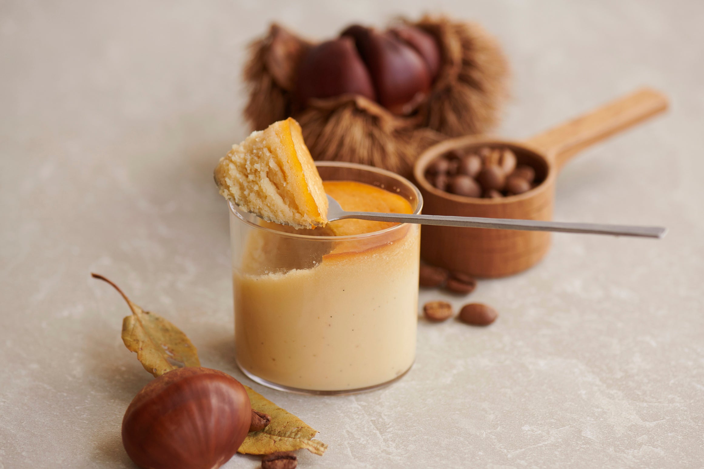 濃い旨みが特長のイタリア産の栗にコーヒーの香ばしい香りを組み合わせた「Cafe au Marron」のカップタイプ。ケーキの上はベイクド、下はレアのような1つで2つの食感をお楽しみいただけます。