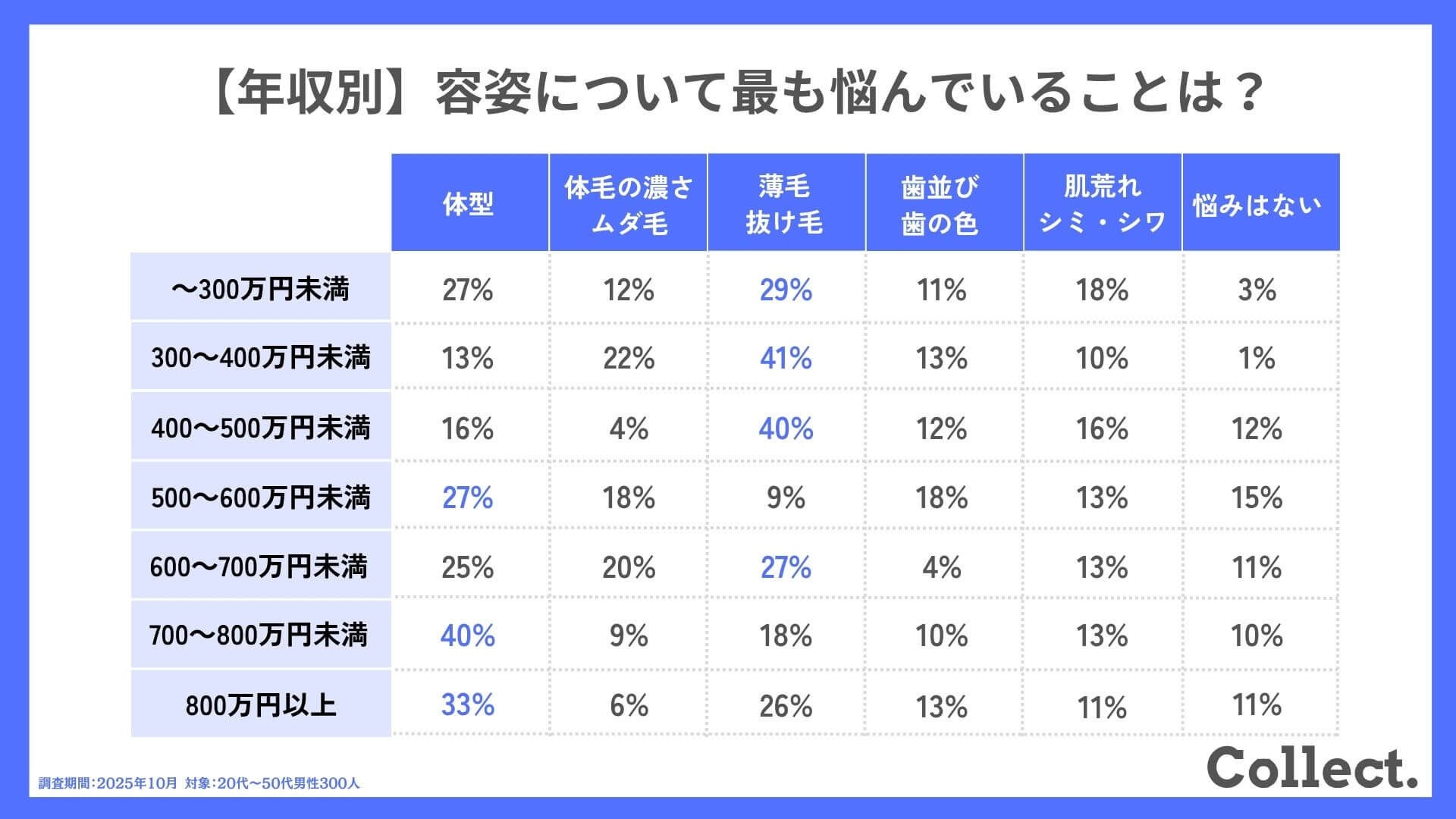 年収400万円未満では「薄毛・抜け毛」が3~4割と高く、悩み全体の中心となっています。500万円以上になると「体型」や「歯並び・歯の色」への関心が増し、見た目の印象や健康への投資意識が高まる傾向が見られます。特に年収700万円以上では「体型(40%)」が最多で、美意識の方向性が変化していることが特徴です。