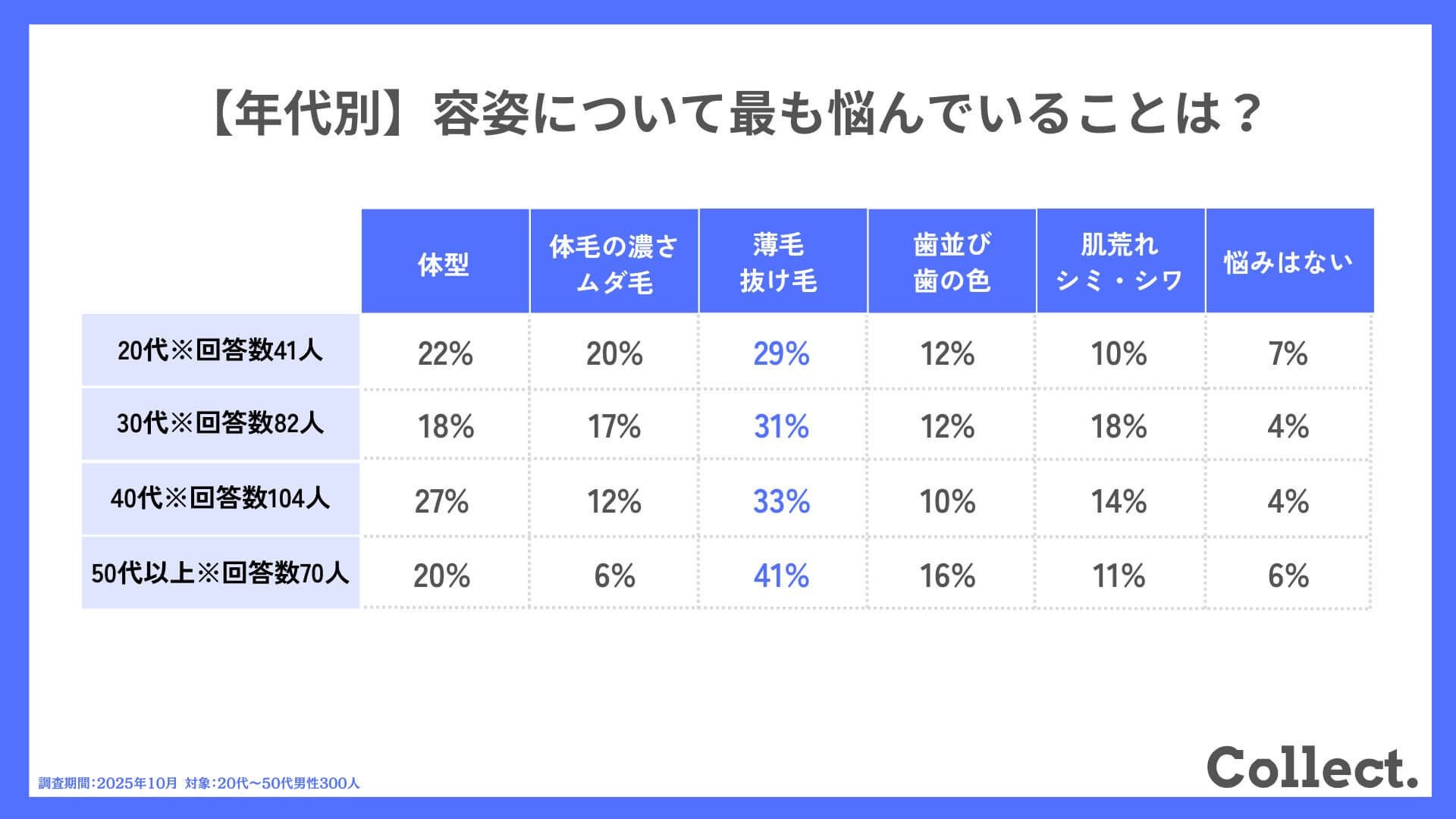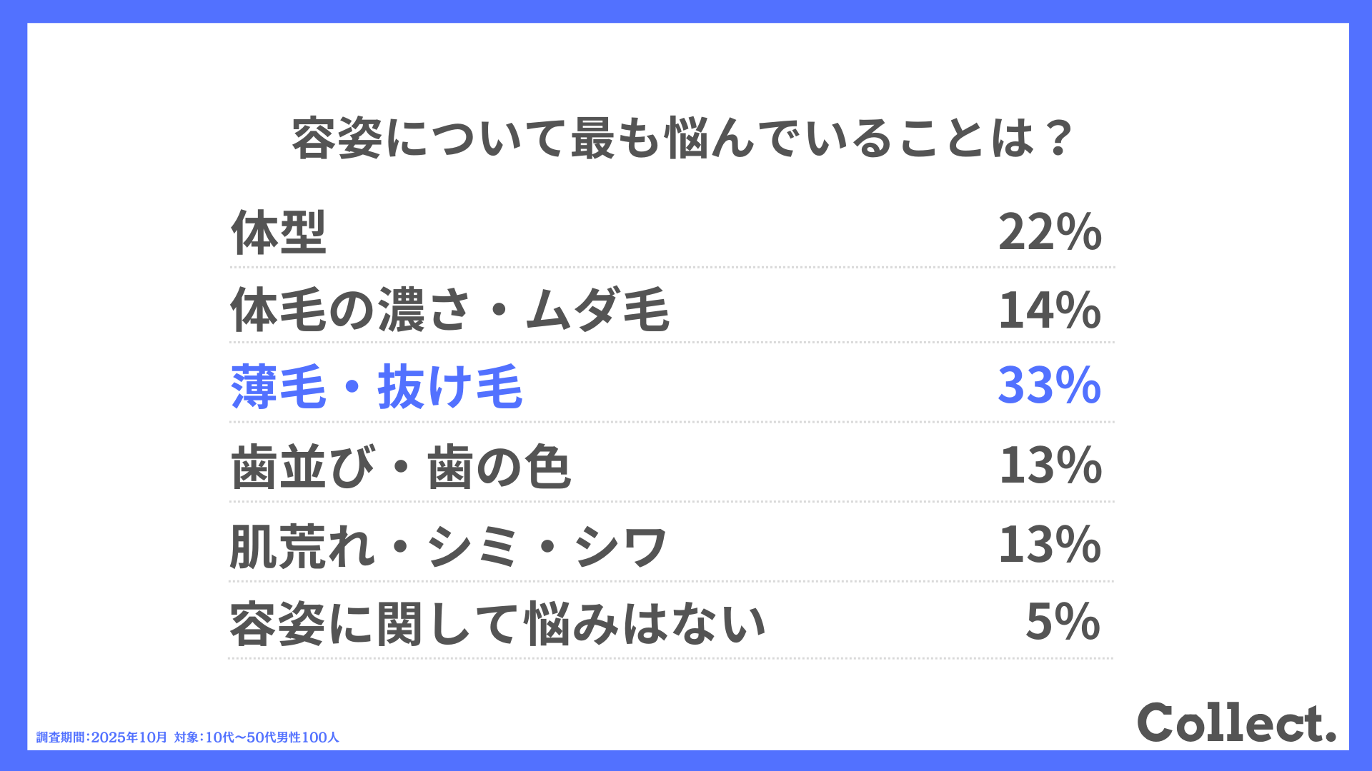 男性の容姿の悩みは「髪」に集中。20代でも29%が薄毛・抜け毛に悩み【collect.(コレクト)】