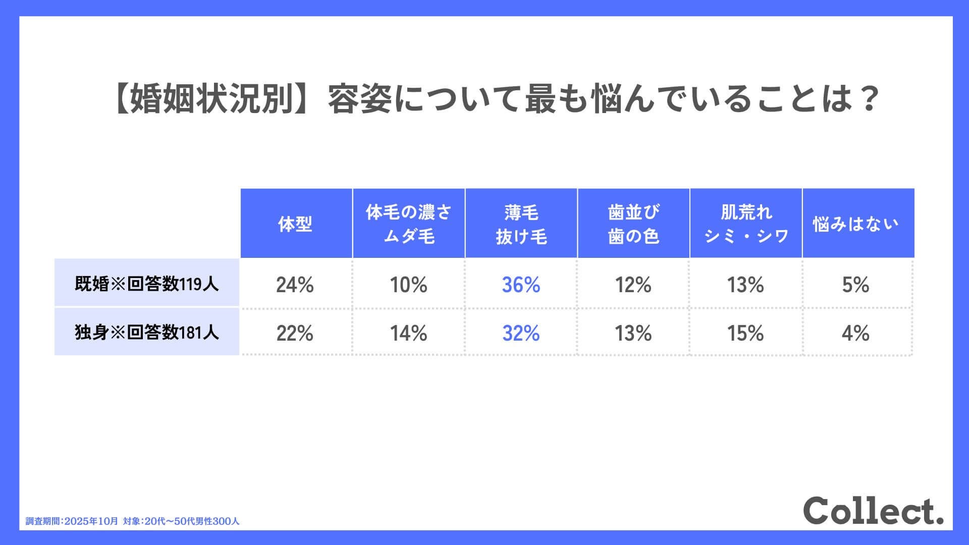 婚姻状況にかかわらず、男性の多くが外見に何らかの悩みを持つ実態が浮き彫りに