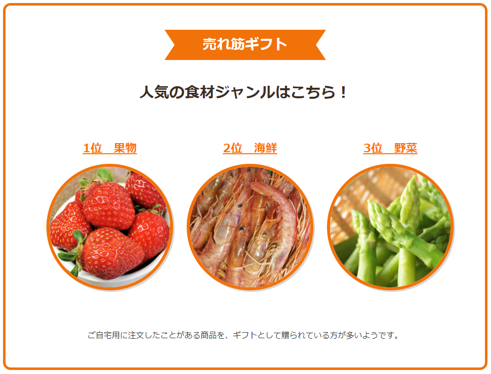 産直アウル内でギフト商品として人気なのは、1位「果物」2位「海鮮」3位「野菜」。傾向としては、自宅用に自分が試したことのある商品をギフトとして贈られている方が多いようです。
