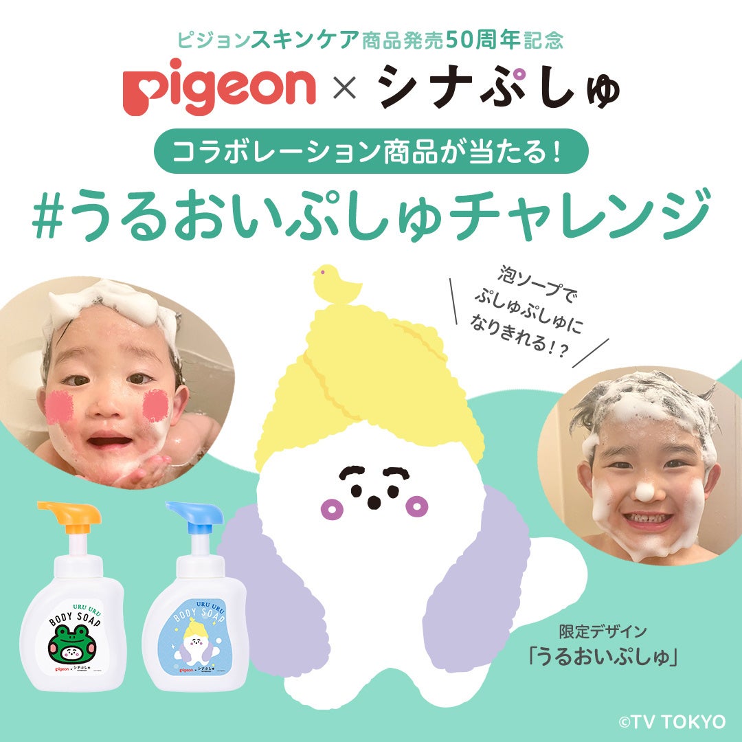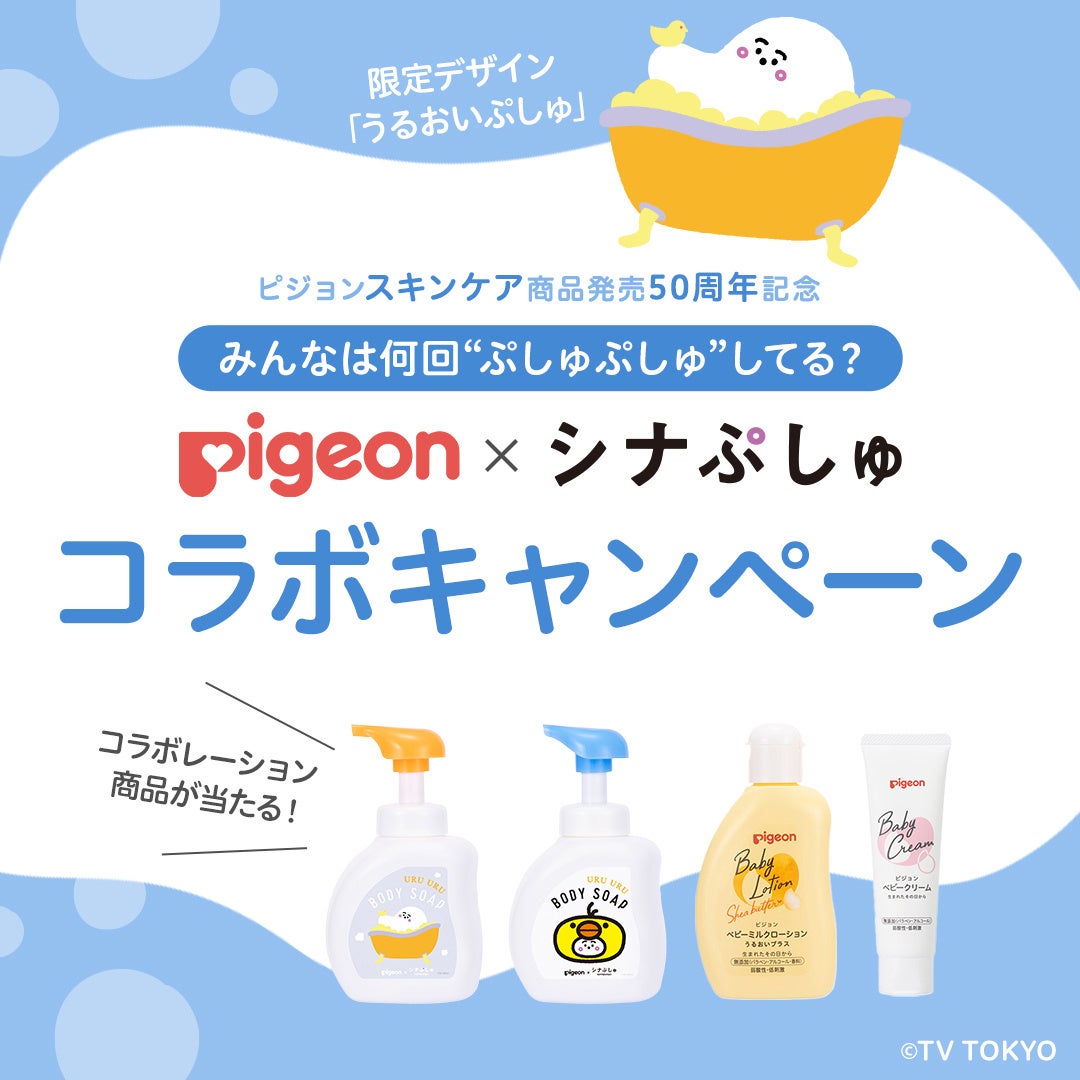 ピジョン株式会社(本社:東京、社長:北澤 憲政)は、ベビースキンケア商品シリーズ「ピジョン ベーシックスキンケア」(https://pigeon.info/skincare/item/basic.html)の発売50周年を記念し、テレビ東京系列で放送中の乳幼児向け人気番組「シナぷしゅ」とコラボレーションした企画を2024年4月26日(金)より開催いたします。全身泡ソープなど対象商品をご購入いただいた方へ、ピジョン限定デザインの「うるおいぷしゅ オリジナルボトルシール」をプレゼントします。またオリジナルボトルシールが付いたベビースキンケア商品の詰め合わせセットが抽選で当たるSNSキャンペーンを実施いたします。