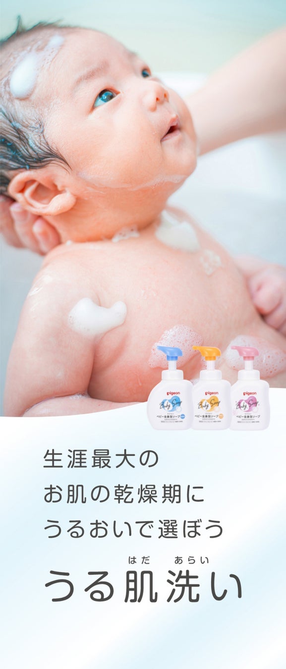 赤ちゃんの肌は、生後3ヵ月からうるおいを左右する皮脂の分泌量が減り続け、思春期に至るまでの長い間、“生涯最大のお肌の乾燥期”を迎えるといわれています(1)。ピジョンはこれからも、洗いながら保湿する「うる肌洗い」を始め、保湿力たっぷりのうるおいで未熟な赤ちゃんの肌を守っていきます。