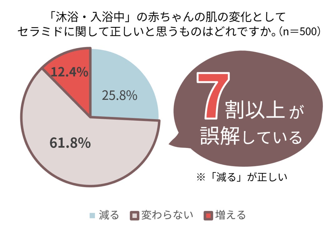 入浴中に肌は水分を含み飽和状態になり、角層細胞が広がることで保湿成分「セラミド」などのうるおい成分が体外へ流出している(2)ことは、あまり知られていません。2024年2月に当社が行った調査(※4)によると、半数以上のプレママ・ママが「知らない、知らなかった」と回答しており、「聞いたことはあるが、詳しくは知らない」も含めると9割近くに上りました。沐浴・入浴中の肌の変化に関する質問では、7割以上の方が入浴中にセラミドが「変わらない」または「増える」と誤解していることがわかりました。