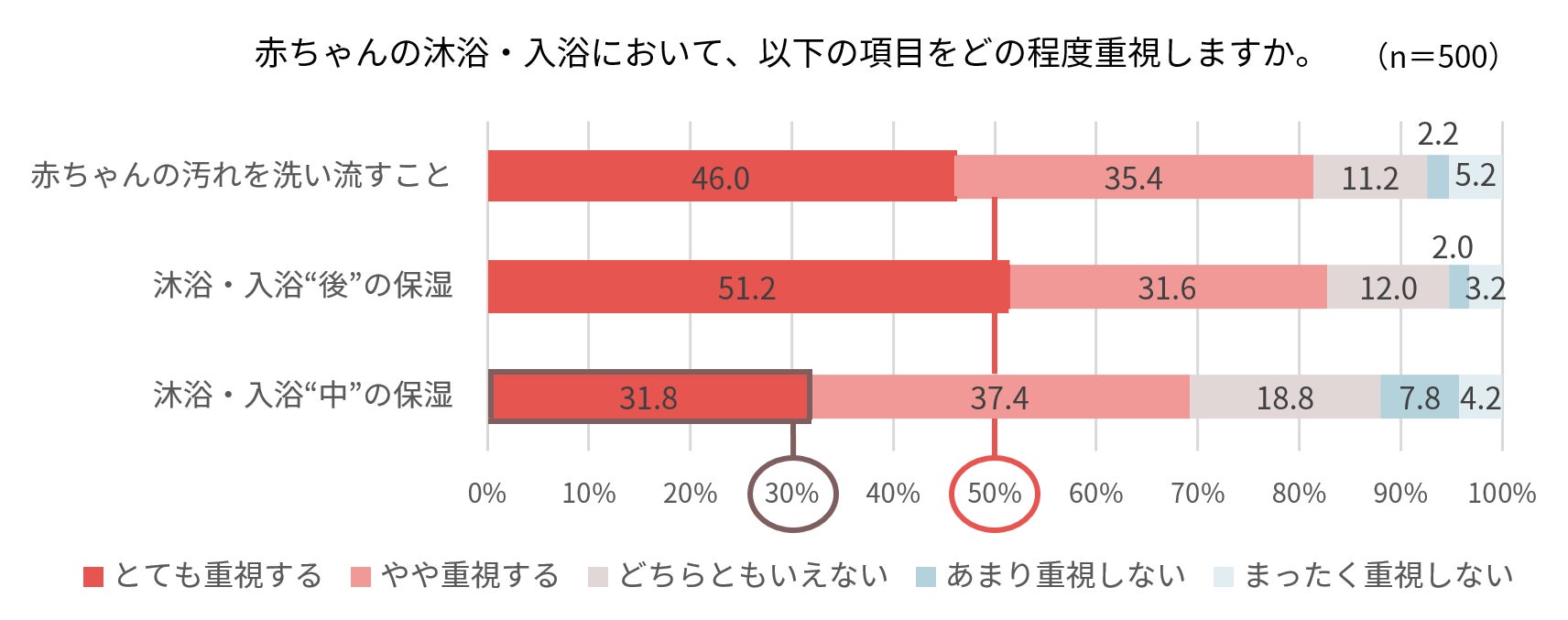 また、沐浴・入浴において「とても重視する」こととして、約5割のプレママ・ママが「汚れを洗い流すこと」や「沐浴・入浴“後”の保湿」と回答。一方で、「沐浴・入浴“中”の保湿」は3割程度で約20ポイントの差があり、赤ちゃんのからだを洗う段階からの保湿への意識は低いことが明らかになりました。