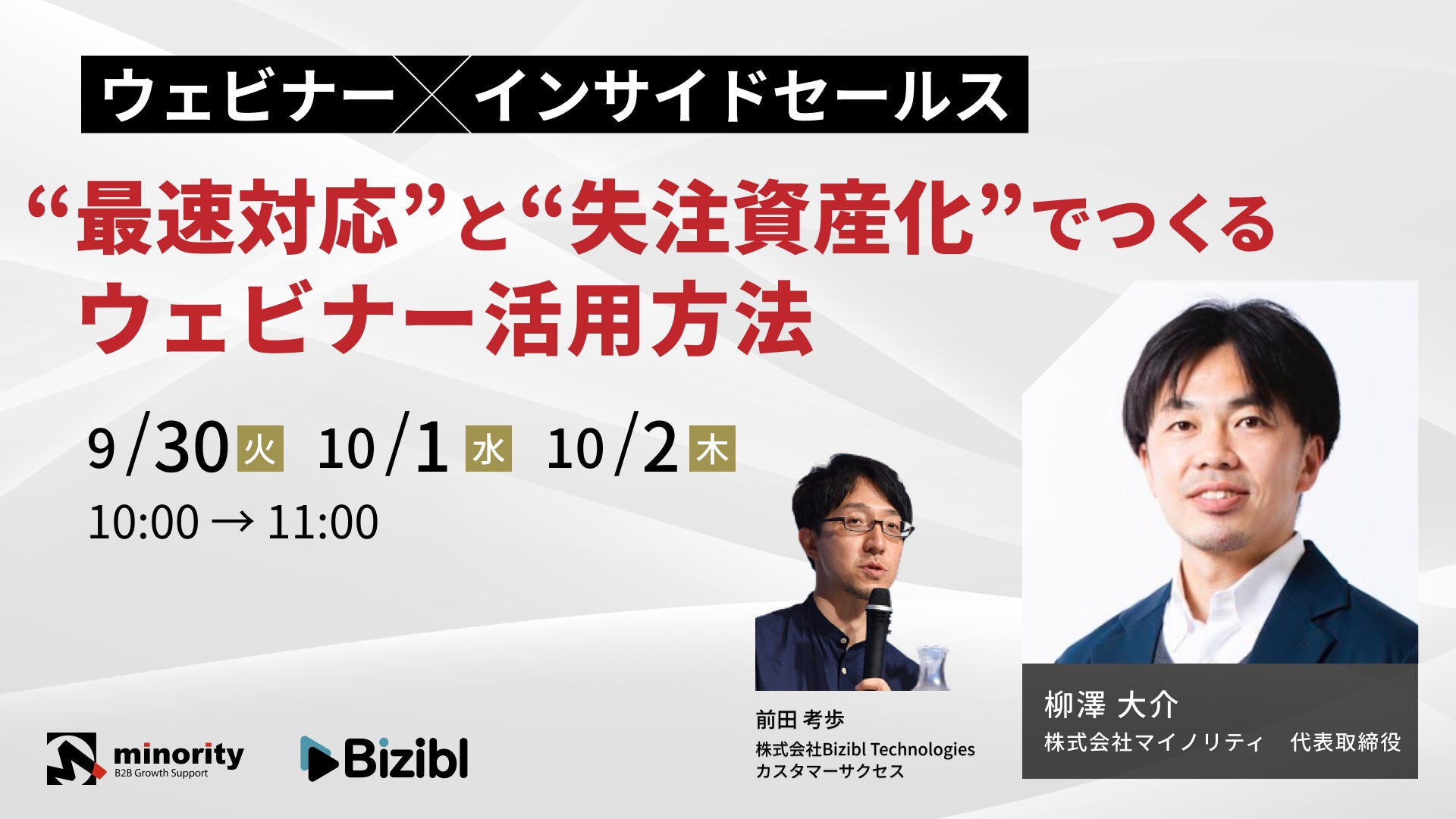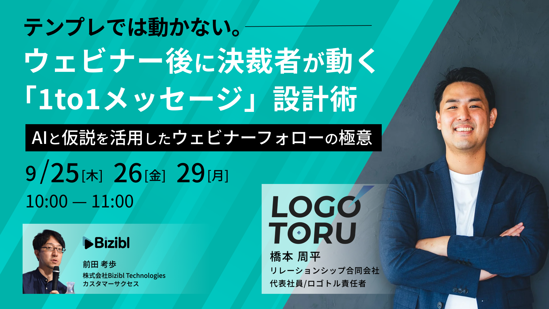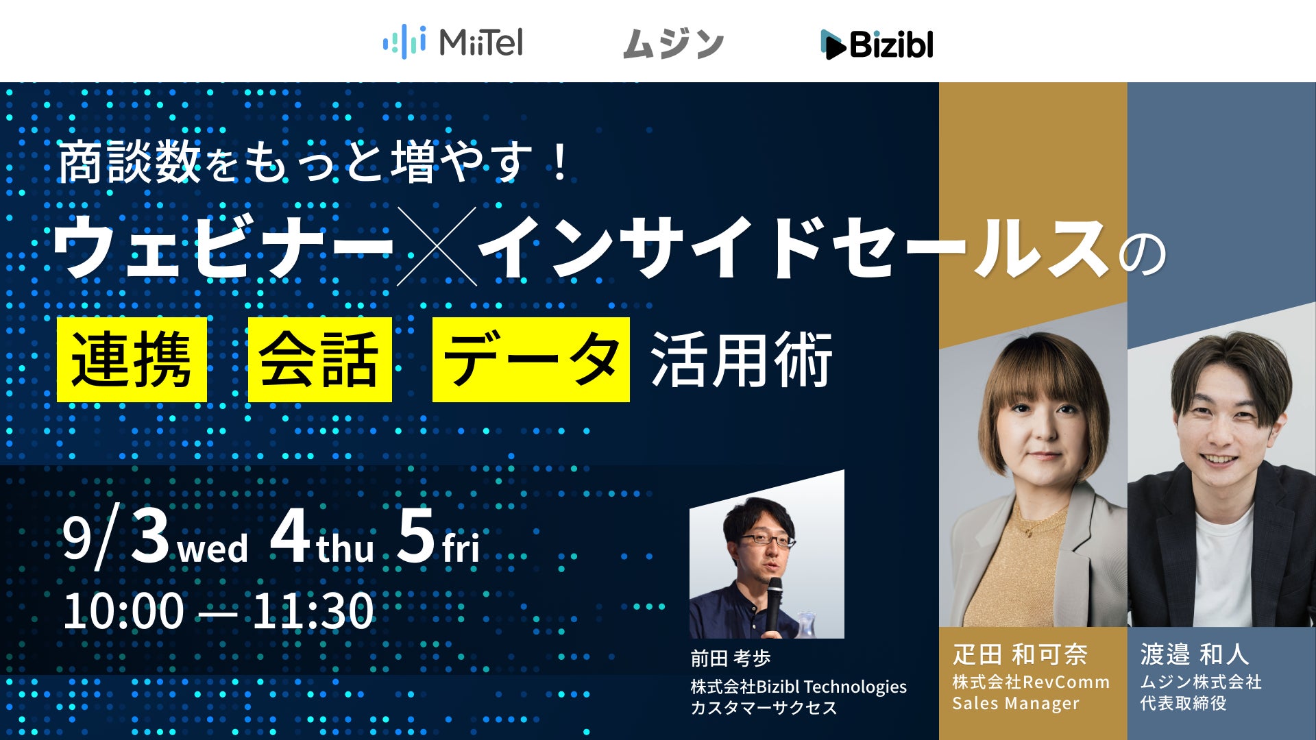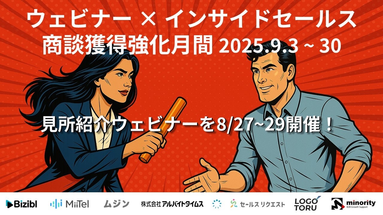 株式会社Bizibl Technologies(よみ:ビジブルテクノロジーズ、本社:東京都千代田区、代表取締役:花谷燿平、以下当社)は、2025年9月の1か月間、インサイドセールス(以下、IS)とウェビナーの連携によって商談獲得数・獲得率を向上させるための実践ウェビナーシリーズ「ウェビナー × インサイドセールス強化月間」を全6回にわたり開催します。