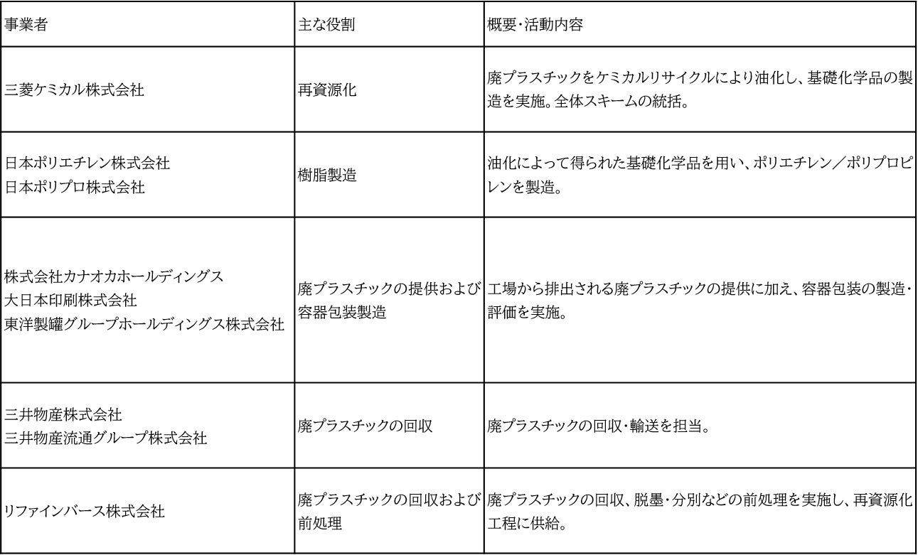 三菱ケミカル株式会社、日本ポリエチレン株式会社、日本ポリプロ株式会社、株式会社カナオカホールディングス、大日本印刷株式会社、東洋製罐グループホールディングス株式会社、三井物産株式会社、三井物産流通グループ株式会社、リファインバース株式会社は、経済産業省「令和7年度 資源自律経済確立産官学連携加速化事業費(広域自治体における資源循環システムの構築に向けた実証事業)」に参画し、大都市圏における、地域特性に応じた資源循環システムの構築に向け、再生プラスチックを中心とした再生材の大規模供給体制に関する課題を分析・検証します。