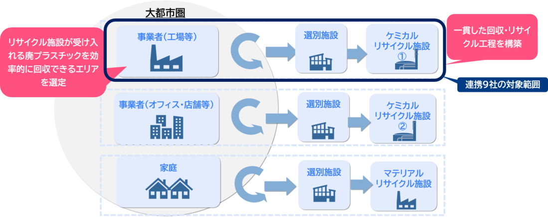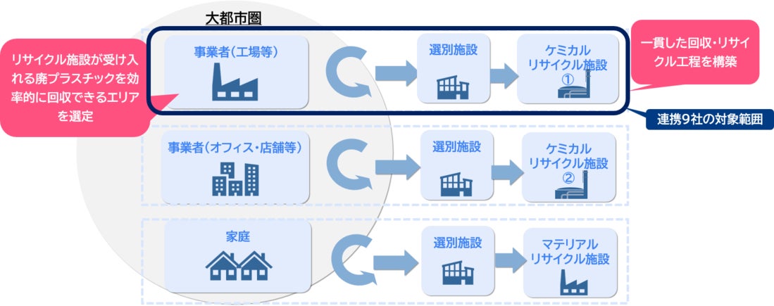 本実証事業のうち、連携9社は、「大都市圏」において、工場から排出される廃プラスチックを対象に、分別・回収からケミカルリサイクル、再生材製造に至るまでの一貫したサプライチェーンの実証を行います。各社の専門領域を活かし、大都市圏における効率的かつ高品質な資源循環モデルの構築を目指します。各社の主な役割は以下の通りです。