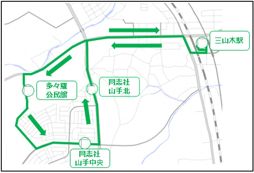 ・三山木駅④のりば→多々羅公民館→同志社山手中央(※1)→同志社山手北(※1)→三山木駅