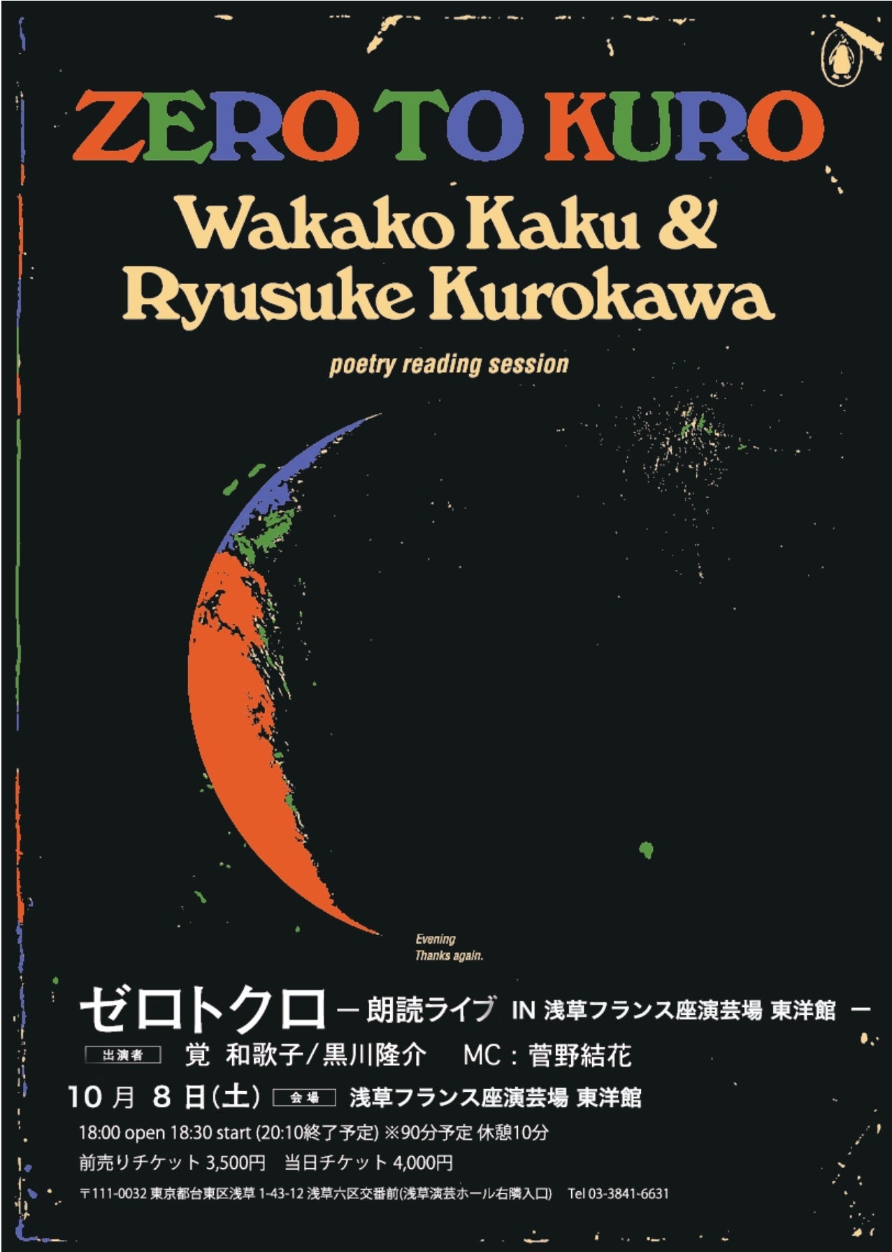 今年6月、ポップスから合唱曲、校歌など、あらゆるジャンルで数百編の歌詞をリリースし、 2001年映画「千と千尋の神隠し」主題歌<いつも何度でも>の作詞でレコード大賞金賞を受賞した覚 和歌子と、マガジンハウス『POPEYE』、「meeth」のなどでの連載、企業の広告コピーライティングも手掛ける黒川 隆介による詩の朗読ライブ「ゼロトクロvol.1」での競演が話題を集めた。その反響もあり、今回は規模を拡大、浅草フランス座演芸場 東洋館でvol.2を開催する運びとなった。