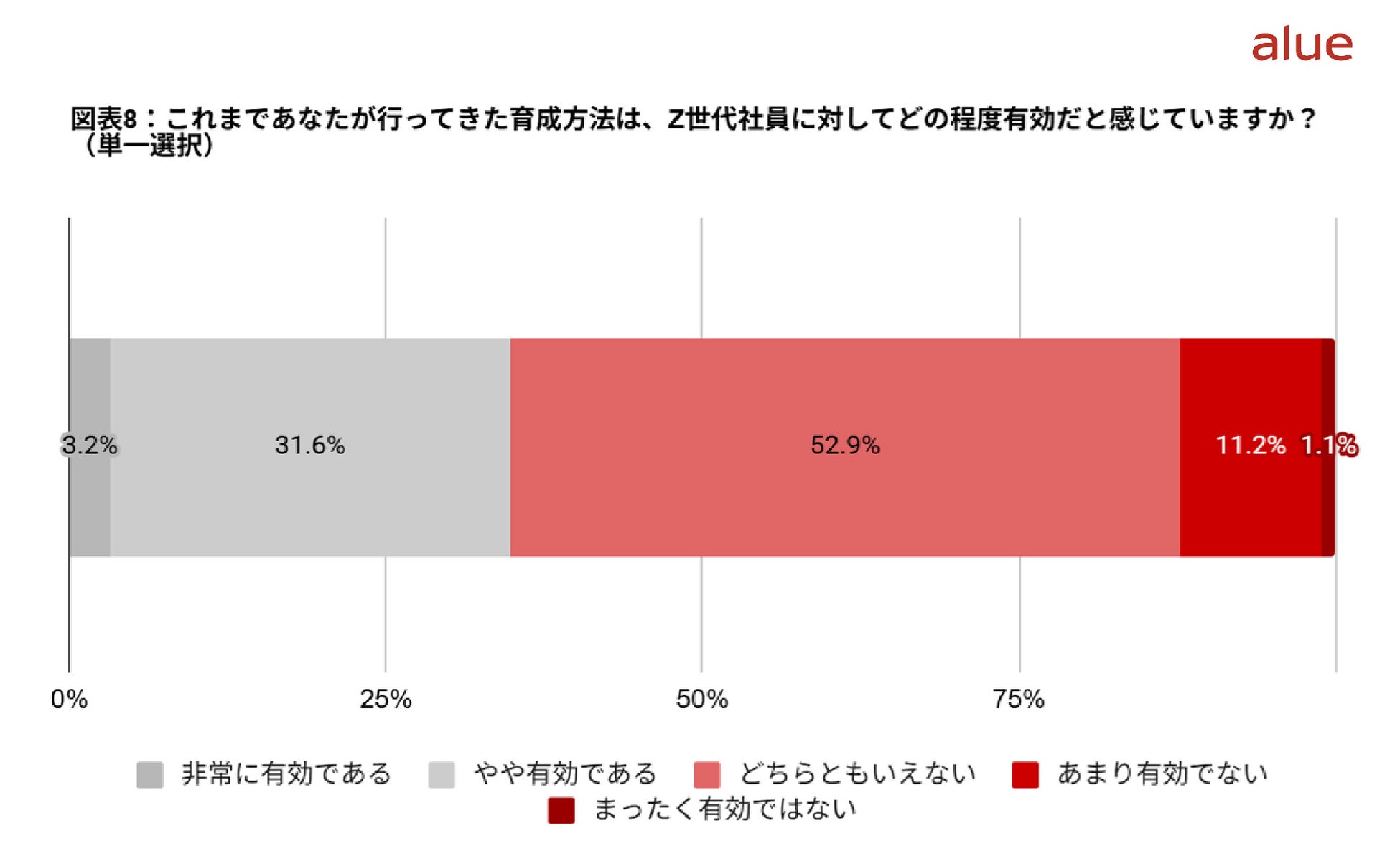 Z世代部下の育成方法について、「有効だと確信が持てない」と回答した管理職は65.2%にのぼりました。内訳を見ると、「どちらともいえない」が52.9%と半数を超えており、「あまり有効ではない」「まったく有効ではない」を含めると、育成方法の有効性を判断しきれていない管理職が多数派であることが分かります。
