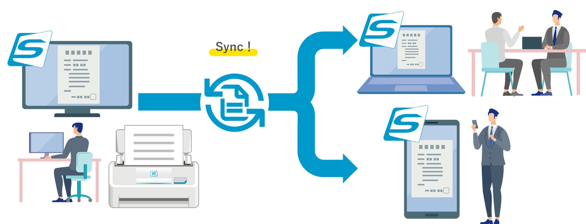 オフィスや自宅でスキャンしたものを、スマートフォンから出先で確認する、オフィスと自宅のPCで同じデータを管理するなど、ScanSnap Homeでのデータ管理を、場所・デバイスを越えて実現できます。