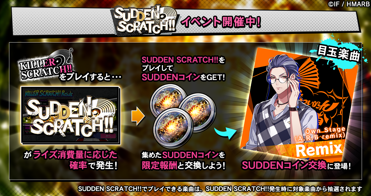 イベント期間中、KILLER SCRATCH!!をプレイするとライズ消費量に応じた確率でSUDDEN SCRATCH!!が発生します。SUDDEN SCRATCH!!をプレイすると、通常の報酬アイテムの他、限定アイテム「SUDDENコイン」を獲得することができます。「SUDDENコイン」を集めることで、新楽曲「Own Stage(A.R.B remix)」と交換することが可能です。詳細はアプリ内お知らせをご確認ください。