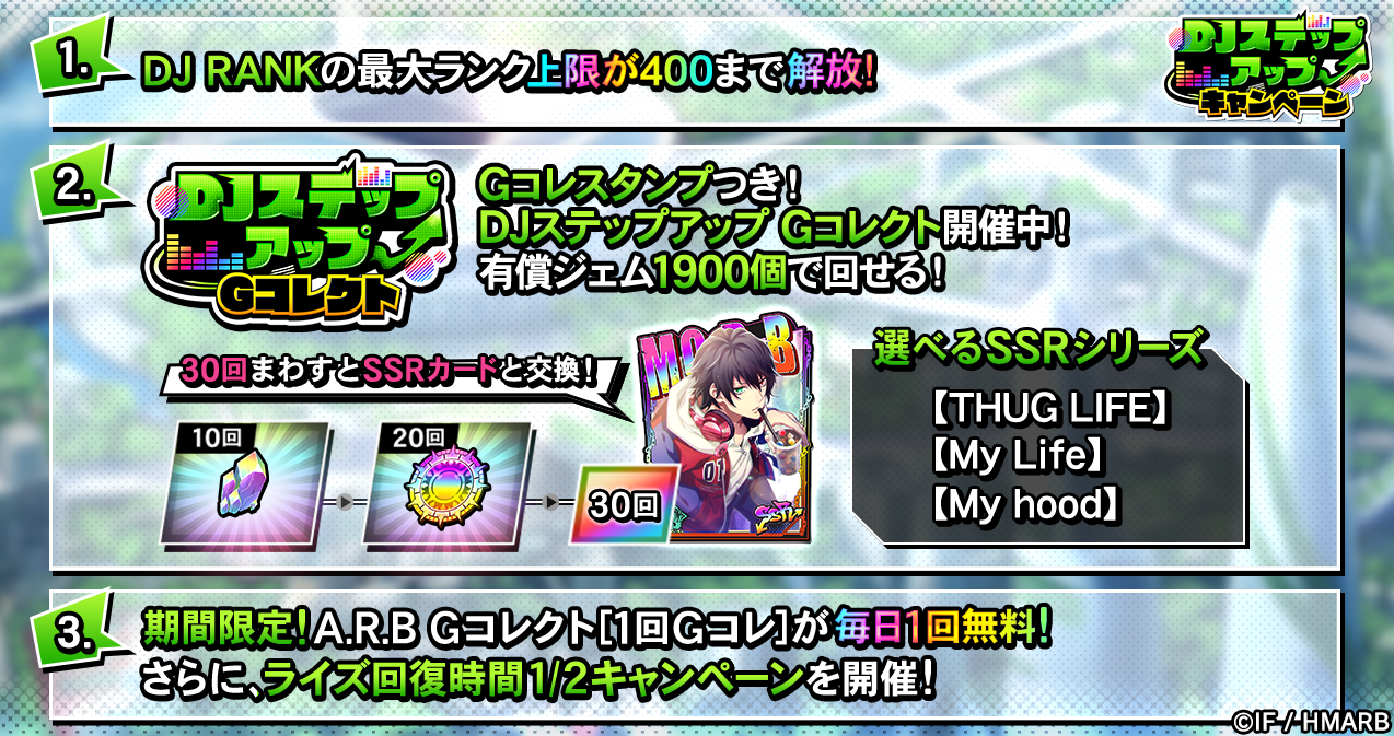 期間中A.R.B Gコレクトの[1回Gコレ]を1日1回、無料で回すことができるほかに、ビンゴミッションやログインボーナス、ライズ回復時間1/2キャンペーンなどを開催しています。詳細はアプリ内お知らせをご確認ください。