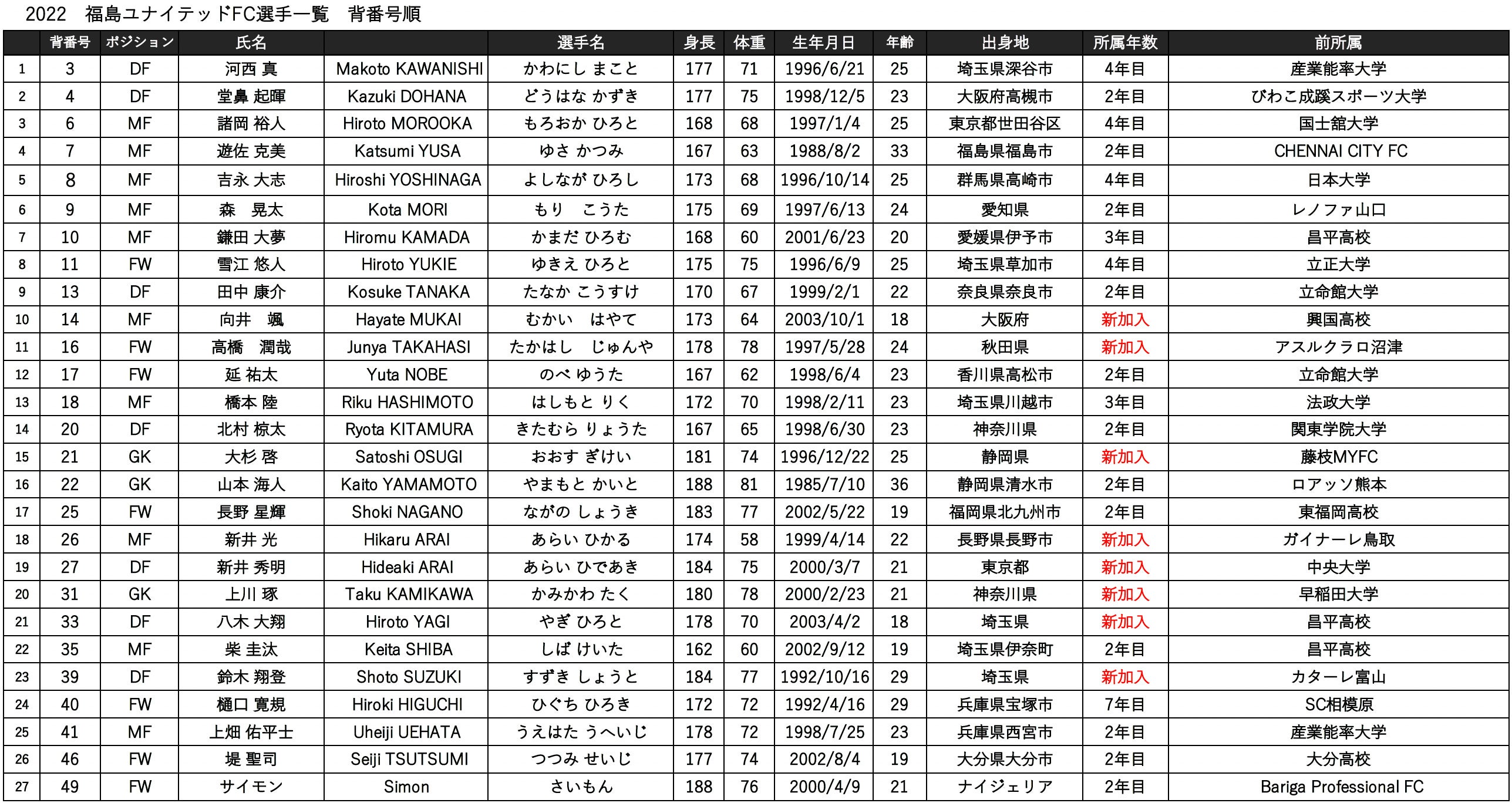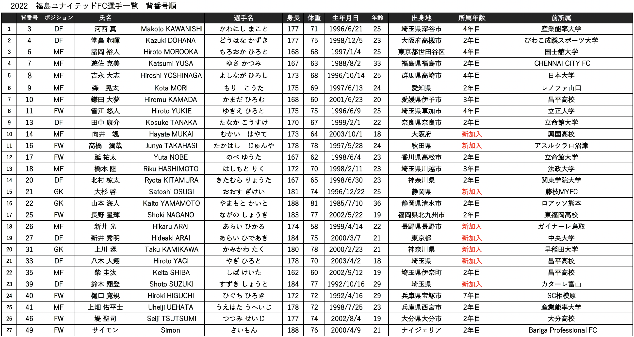 【福島ユナイテッドFC】2022シーズン チーム新体制及び選手背番号決定のお知らせ