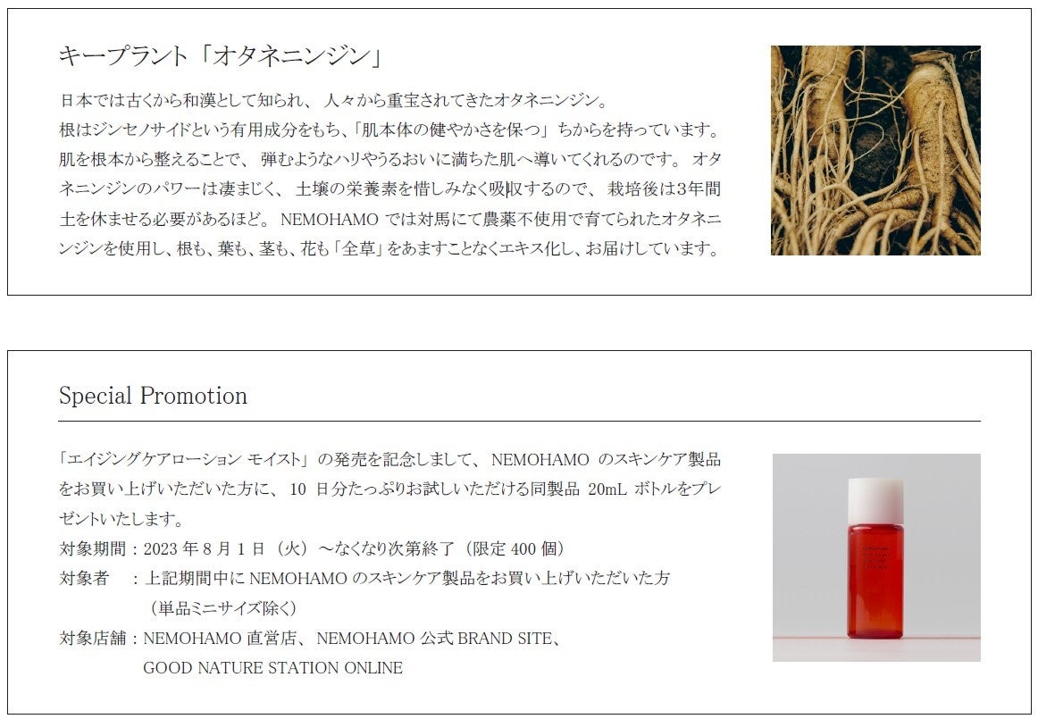 植物まるごとの生命力を活かしたオーガニックコスメブランド「NEMOHAMO (ネモハモ)」は、これまでも年齢肌用化粧水としてご好評をいただいているエイジングケアローションの保湿力をさらにUP※1 させた「エイジングケアローション モイスト」を、2023 年9 月1 日(金) よりNEMOHAMO 直営店および公式オンラインストア、全国のお取扱い各店にて発売開始いたします。