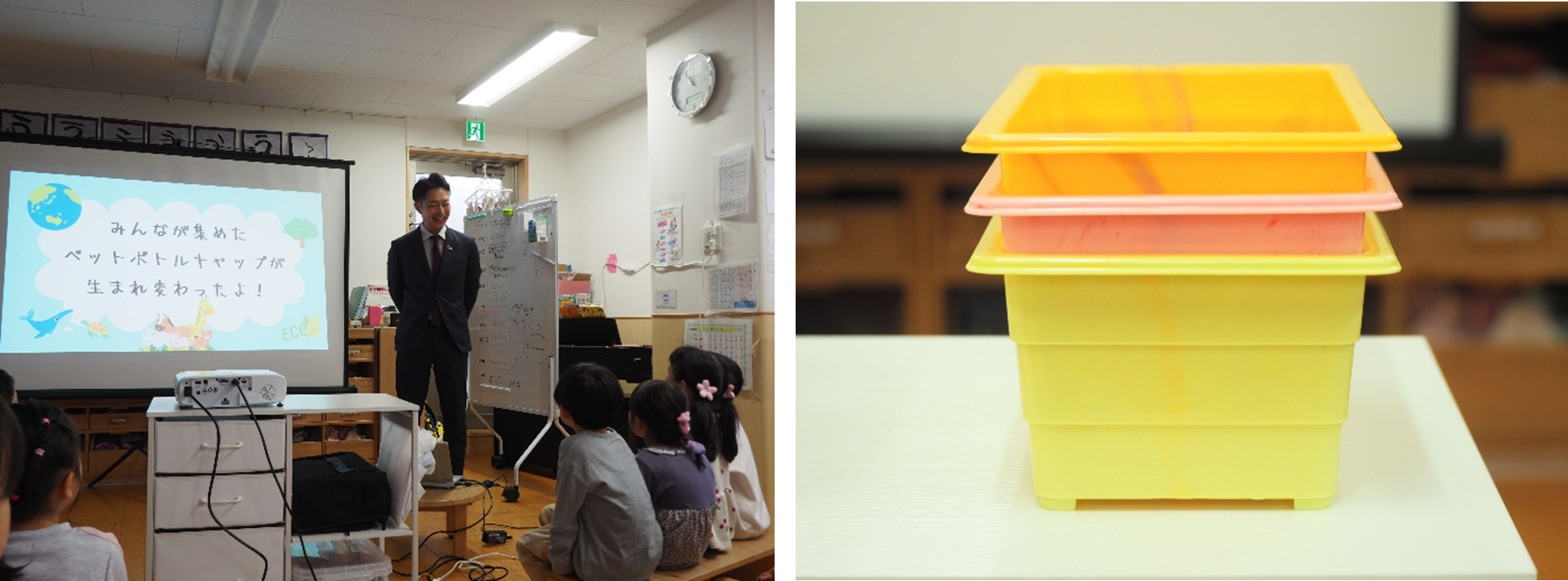今回の環境学習では、園児向けにスライドショーを用いながら、集めたペットボトルキャップがどのように回収・分別され、アップサイクルであるプランターへと生まれ変わるのかを分かりやすく説明しました。