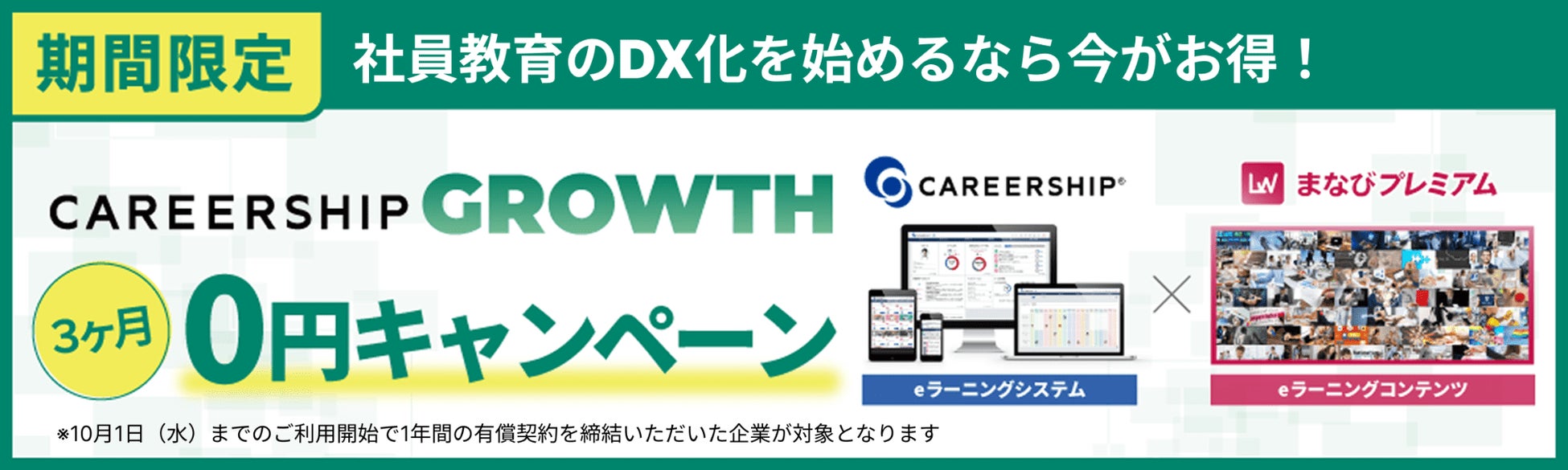 学習管理システムと1,000本以上のeラーニングコンテンツをセットにしたオールインワンサービス「CAREERSHIP GROWTH」を、10月1日(水)までのご利用開始で1年間の有償契約を締結いただいた企業を対象に、契約開始月から3か月間無償でご利用いただけるキャンペーンを実施します。これにより、初期コストの負担を抑えながら、スムーズに教育体制を構築することが可能です。