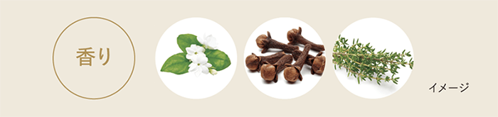 華やかなジャスミンにクローブ、タイムのさわやかな甘さをプラスしたラディアントな香り。
