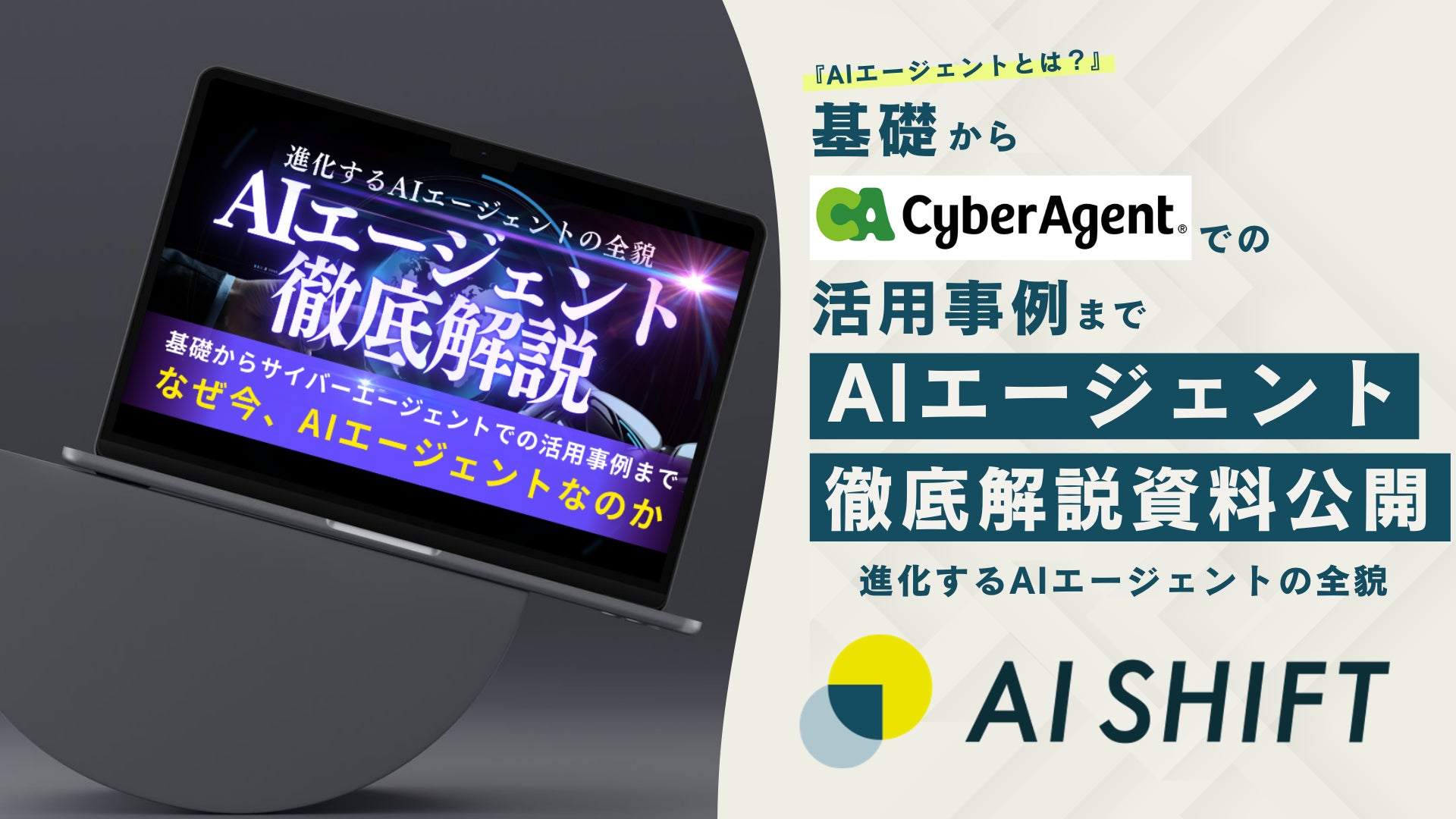 株式会社サイバーエージェント(本社:東京都渋谷区、代表取締役:藤田晋、東証プライム市場:証券コード4751)の100%子会社で、生成AIの導入を一貫して支援する株式会社AI Shift(本社:東京都渋谷区、代表取締役社長:米山結人)は、これまで生成AIの導入支援を行ってきた経験を活かし、AIエージェントの基礎からサイバーエージェントの活用事例までを徹底解説したお役立ち資料を公開します。