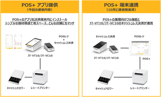 「JT-VT10/JT-VC10」は、マルチ決済が 1 台で対応可能にするオールインワン決済端末です。tance株式会社( https://www.tance.co.jp/ )が提供するサービスプラットフォーム「tance mall(タンスモール)」を通じて、「JT-VT10/JT-VC10」の端末上に「POS+」が提供するアプリケーション「POS+ retail(ポスタス リテイル)」をインストールすることができます。