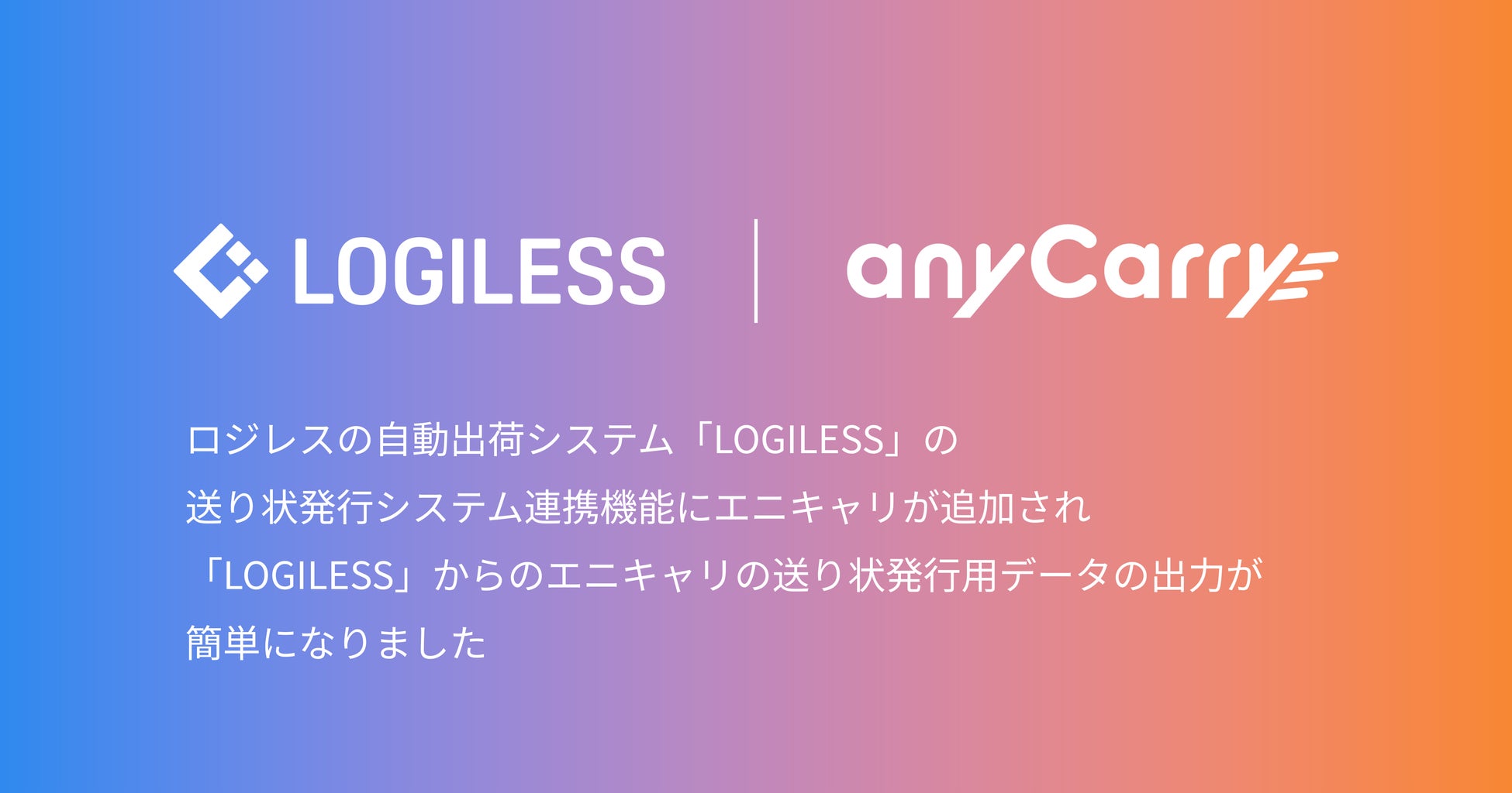 株式会社ロジレス(所在地:東京都品川区、代表取締役CEO:足立直之、以下ロジレス)が提供するOMS・WMS一体型のEC自動出荷システム「LOGILESS」の送り状発行システム連携機能に、株式会社エニキャリ(以下当社)が追加されました。これにより、「LOGILESS」から、当社の送り状発行用データの出力にかかる作業が簡略化され、作業の効率化と出荷ミスの軽減を実現します。