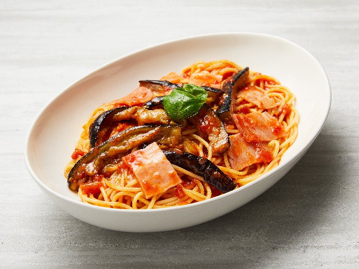 トマト本来の甘さを生かしたオリジナルのコク旨トマトソースに、揚げ茄子×ベーコンの具材が人気No.1の定番パスタです。