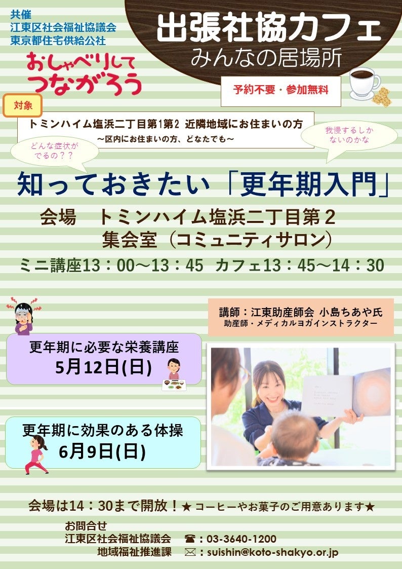 ・江東区のJKK住宅「トミンハイム塩浜二丁目第2」にて、社会福祉協議会と連携したイベント「知っておきたい更年期入門」を5月12日(日曜日)、6月9日(日曜日)に開催