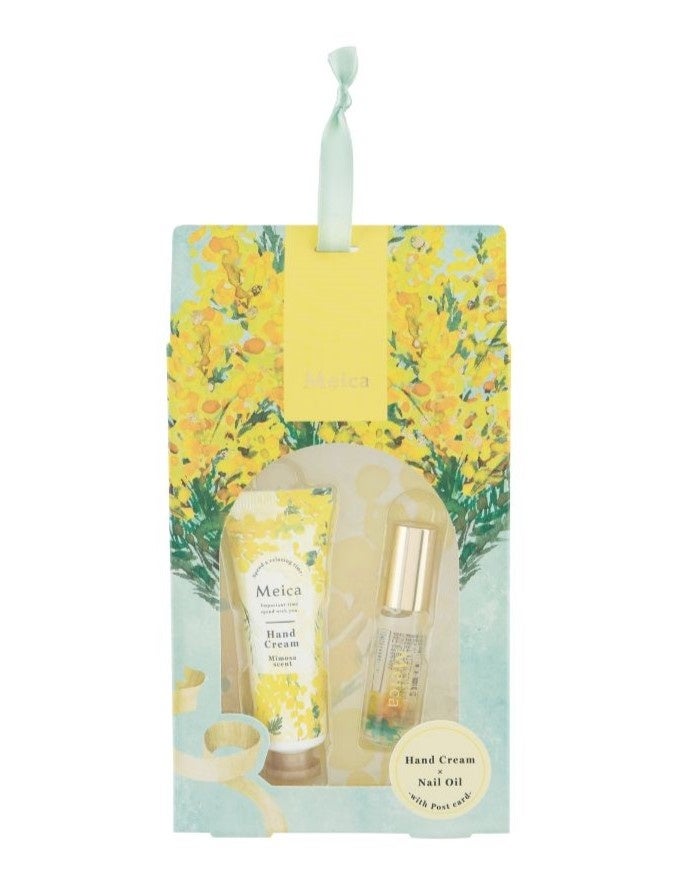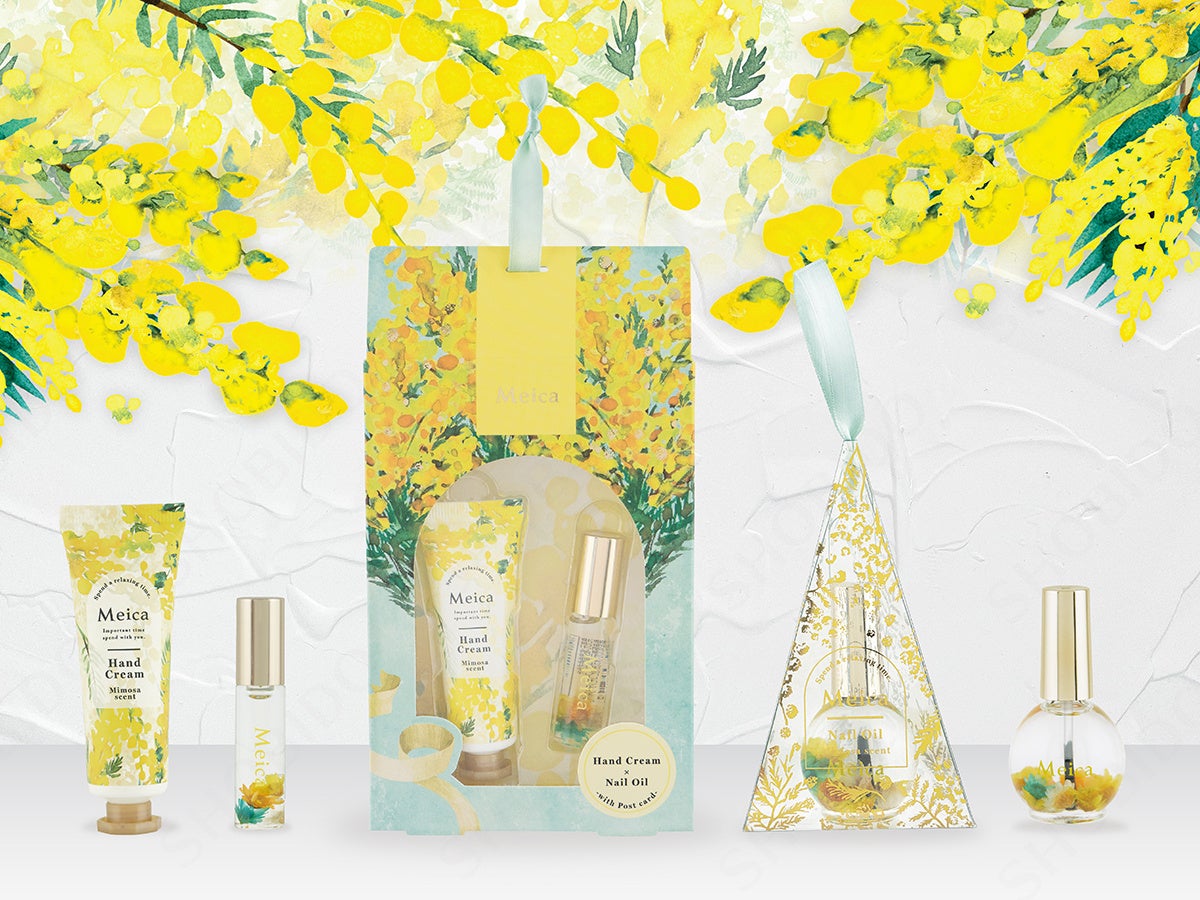 新商品『Meicaミモザシリーズ』は、乾燥が気になるこの時期にうれしい「ネイルオイル」と「ハンドクリーム&ミニネイルオイルセット」の2アイテム。 細部までこだわった華やかなパッケージデザインは、大切な人へのギフトとしてはもちろん自分へのご褒美にも♪