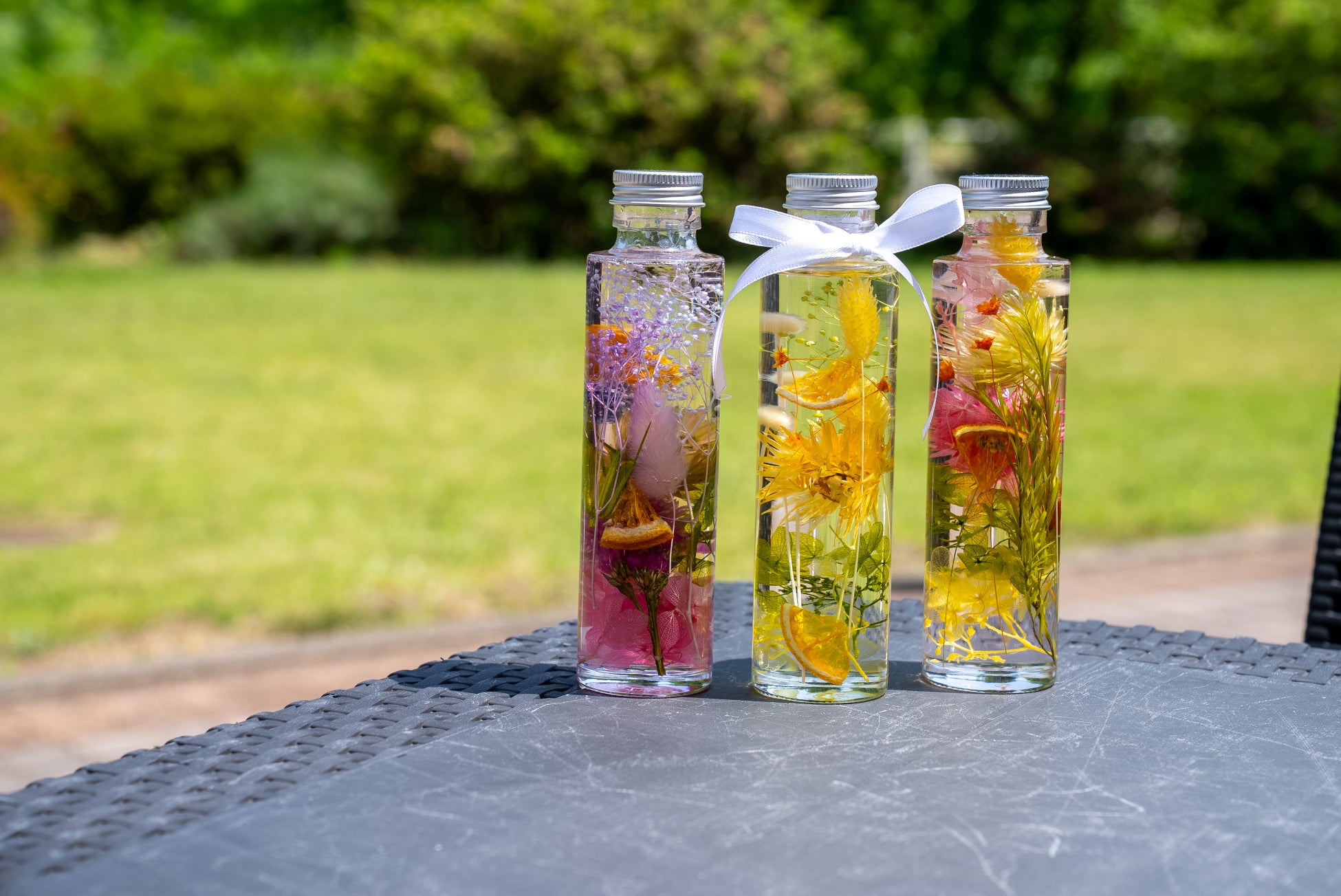 オリジナルハーバリウム作り: 夏の思い出を形に残すワークショップ。ガラスの小瓶にお花をオイル漬けした、インテリアにぴったりのアイテムが作れます 。