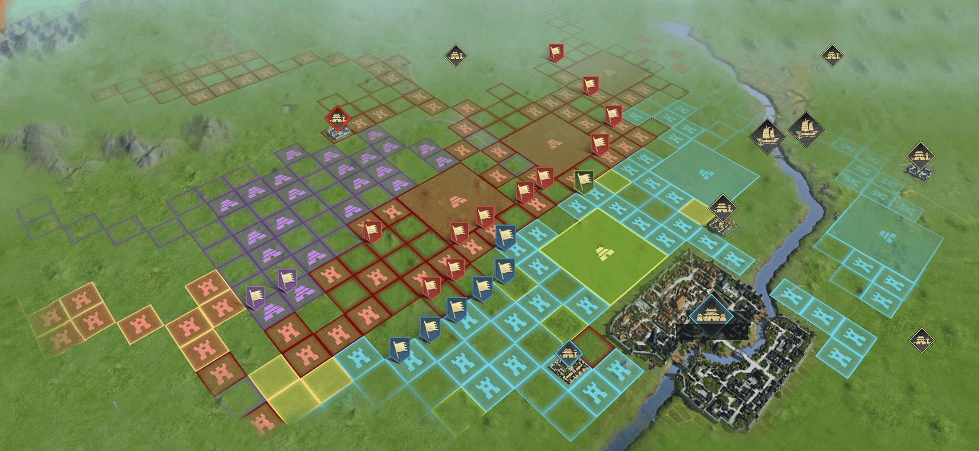 全世界統一バッジョに実装予定の戦略地図は、現代のIT技術をもって古代の戦争を体験できる新機能です。二本の指で画面を縮小すると、通常のゲーム画面が戦略モードの画面に変更します。戦略モードでは、可視範囲が通常画面の20倍以上に広がるだけではなく、土地・城塞・施設の帰属や、駐兵情報といった重要な戦略情報も確認できます。これらの情報を手軽に確認できることで、戦略行動が取りやすくなることでしょう。