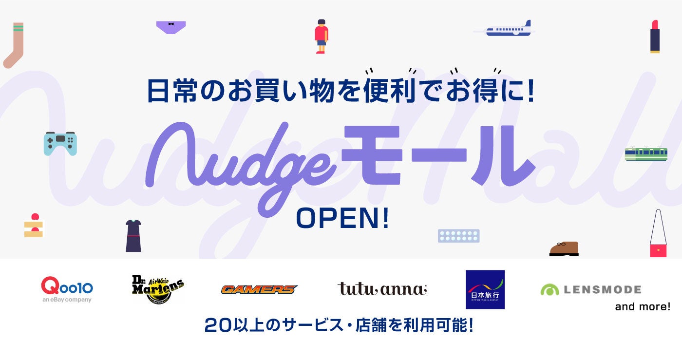 「Nudgeモール」では、第一弾として、日常のお買い物や旅行の予約など、20以上のサービス・店舗でご利用いただけるキャッシュバックサービスを開始いたします。今後も、様々なジャンルのサービスを随時追加していく予定です。