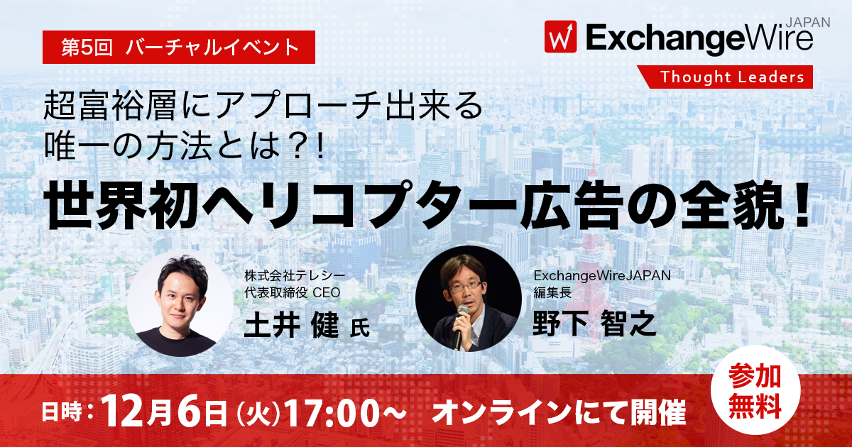株式会社CARTA HOLDINGSのグループ会社で、株式会社電通(本社:東京都港区、代表取締役社長執行役員:榑谷 典洋)と共同で運用型テレビCMプラットフォーム「テレシー」( https://telecy.tv/ )を運営する株式会社テレシー(東京都渋谷区、代表取締役CEO:土井 健)は、データドリブンな広告テクノロジーを専門としたニュースメディア『ExchangeWireJAPAN』(https://www.exchangewire.jp/) 編集長 野下 智之氏と、2022年12月6日(火)17時より、バーチャルミニライブイベント『超富裕層にアプローチ出来る唯一の方法とは?!世界初ヘリコプター広告の全貌!』を開催いたします。